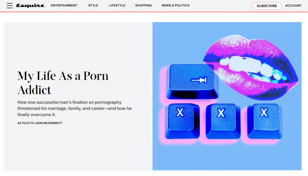 When I heard that, it rang true. The porn I was watching was affecting me in ways I hadn’t considered. I started reading more about the subject, on Wilson’s website, Your Brain on Porn, and the first-person accounts on r/pornfree, a Reddit forum for compulsive porn viewers, and I thought, There’s something to what Wilson is saying.