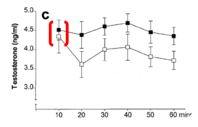 You can clearly see that testosterone levels were nearly identical at 10 minutes, the first measurement. At 20 minutes, the abstinent group declined just a teeny bit, while the pre-abstinent group experienced a significant decline.