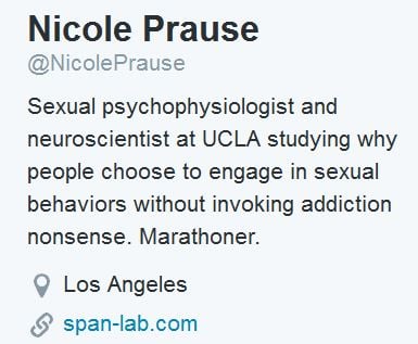 In addition, Nicole Prause’s former Twitter slogan suggests she may lack the impartiality required for scientific research: