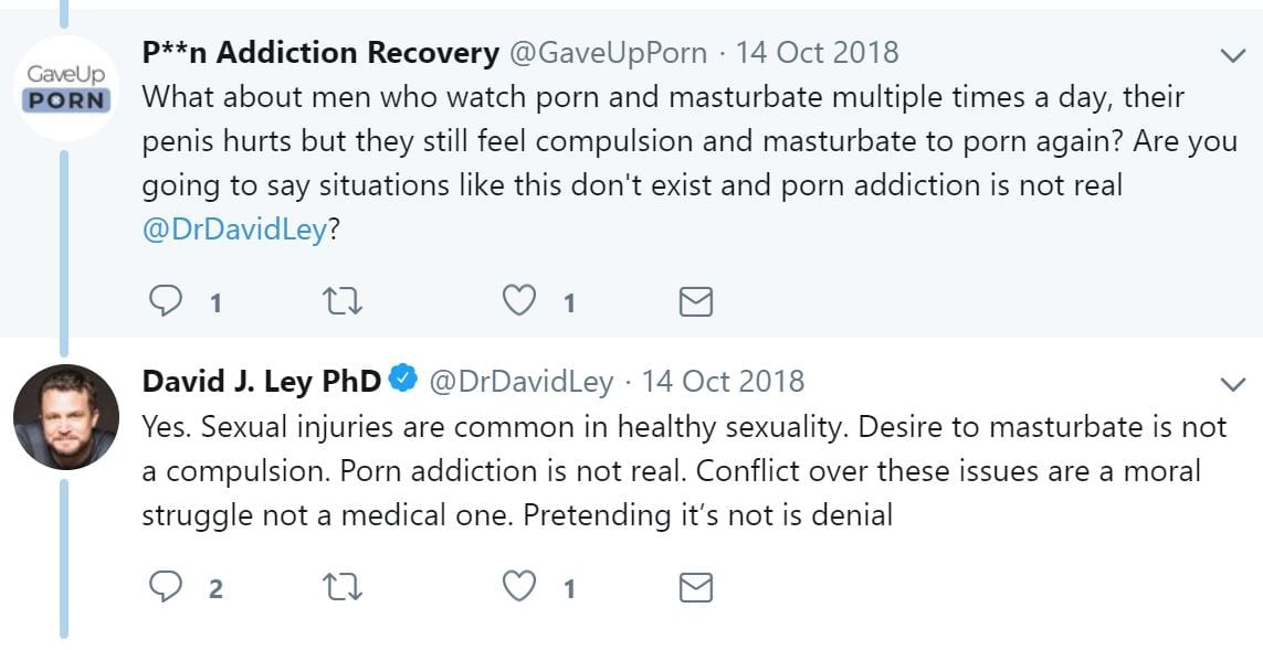 DAVID LEY: The attempt to distinguish porn addiction from sex addiction is a common trope in believers of porn addiction.”