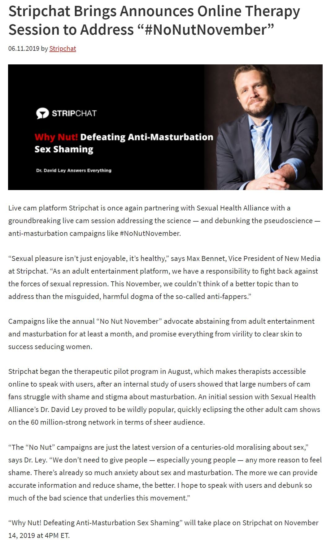 Update #1: StripChat announces another David Ley session: Stripchat Brings Announces Online Therapy Session to Address “#NoNutNovember”