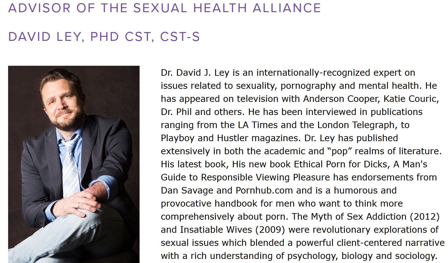Specifically, David Ley and the newly formed Sexual Health Alliance (SHA) have partnered with a xHamster website (StripChat). See “Stripchat aligns with Sexual Health Alliance to stroke your anxious porn-centric brain.” Stripchat purchases the SHA’s presentations, thus indirectly compensating Ley and others for their porn-friendly services.