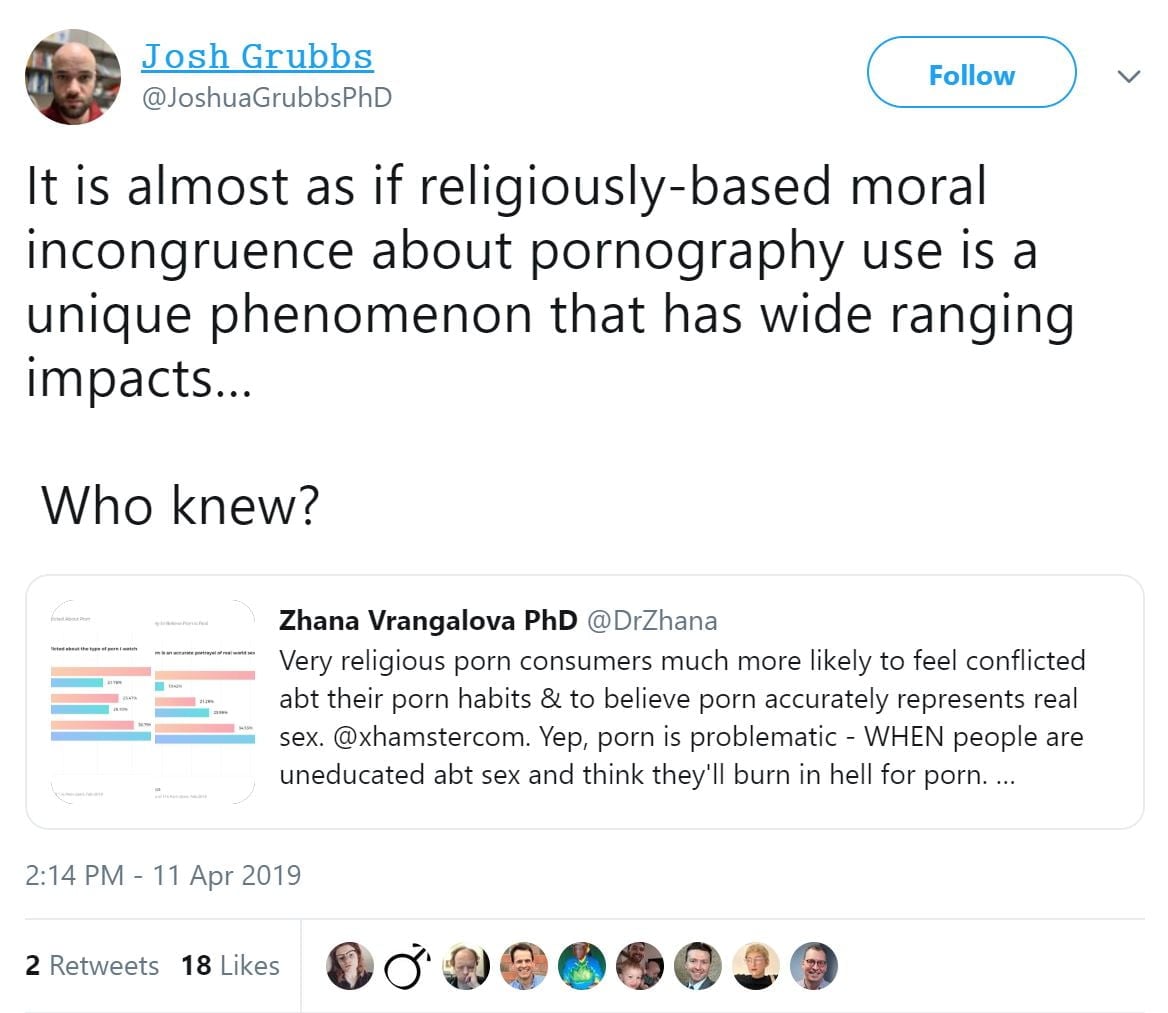 This new study found that behavioral addicts (not just porn addicts) often disapprove of the behaviors they are struggling to eliminate. If that sounds like common sense, it is. But that didn’t stop a group of researchers from using evidence of porn addicts’ natural disapproval to create a powerful, flawed meme that porn problems are likely just due to religious shame or moral disapproval (and thus, by implication, that porn addiction isn’t real). Here’s the man behind the myth, Josh Grubbs, pushing his agenda: