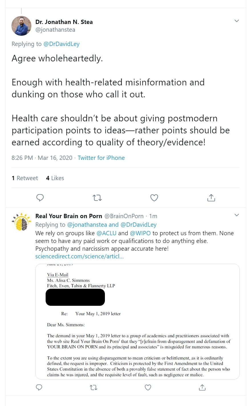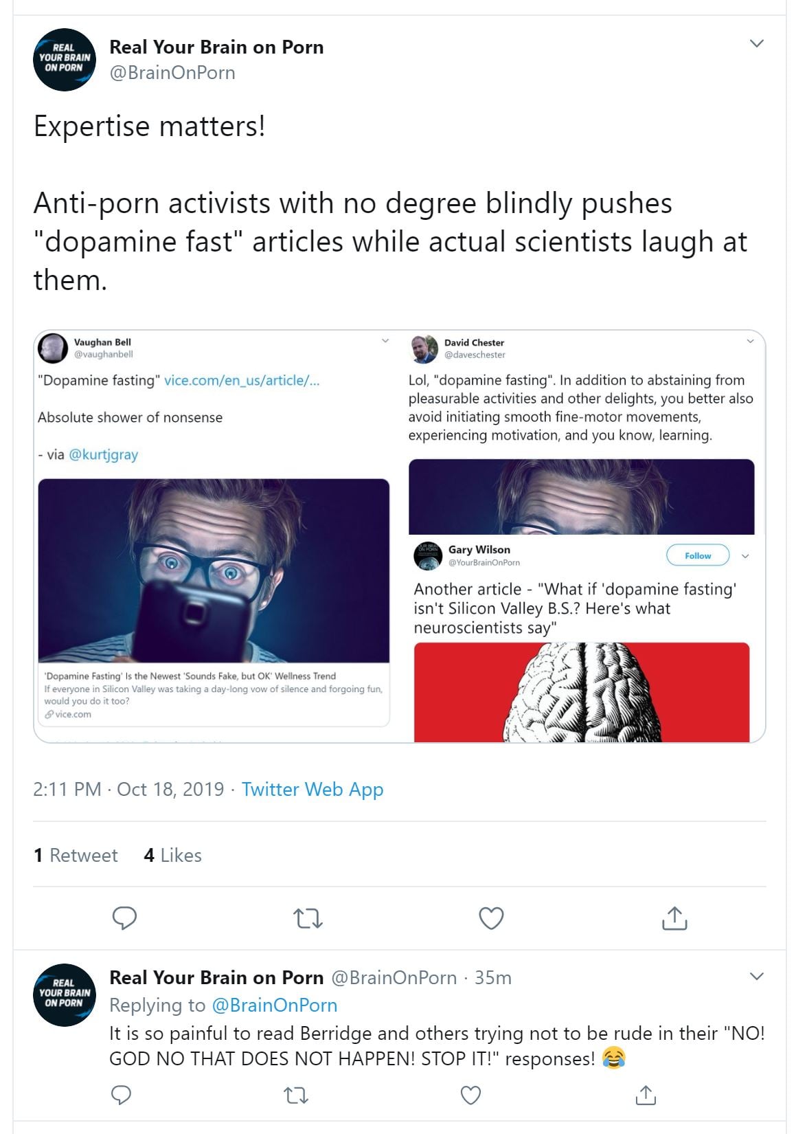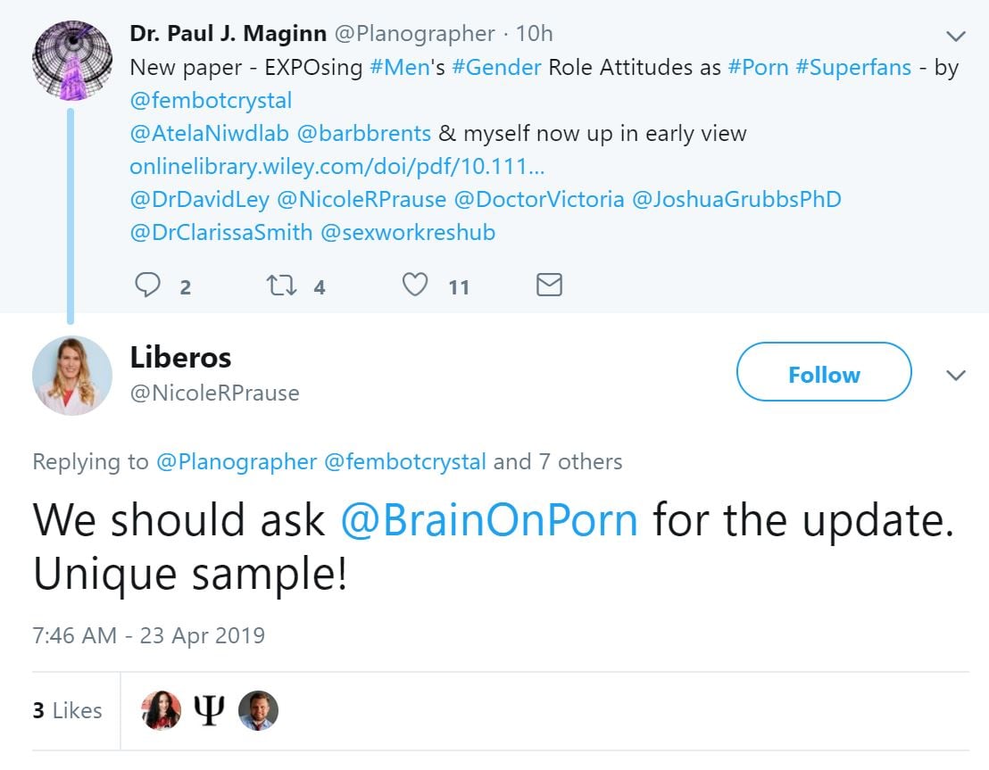 In reality, @BrainOnPorn has posted dozens of additional tweets targeting Rhodes and Nofap: Nicole Prause, David Ley & @BrainOnPorn’s long history of harassing & defaming Alexander Rhodes of NoFap.