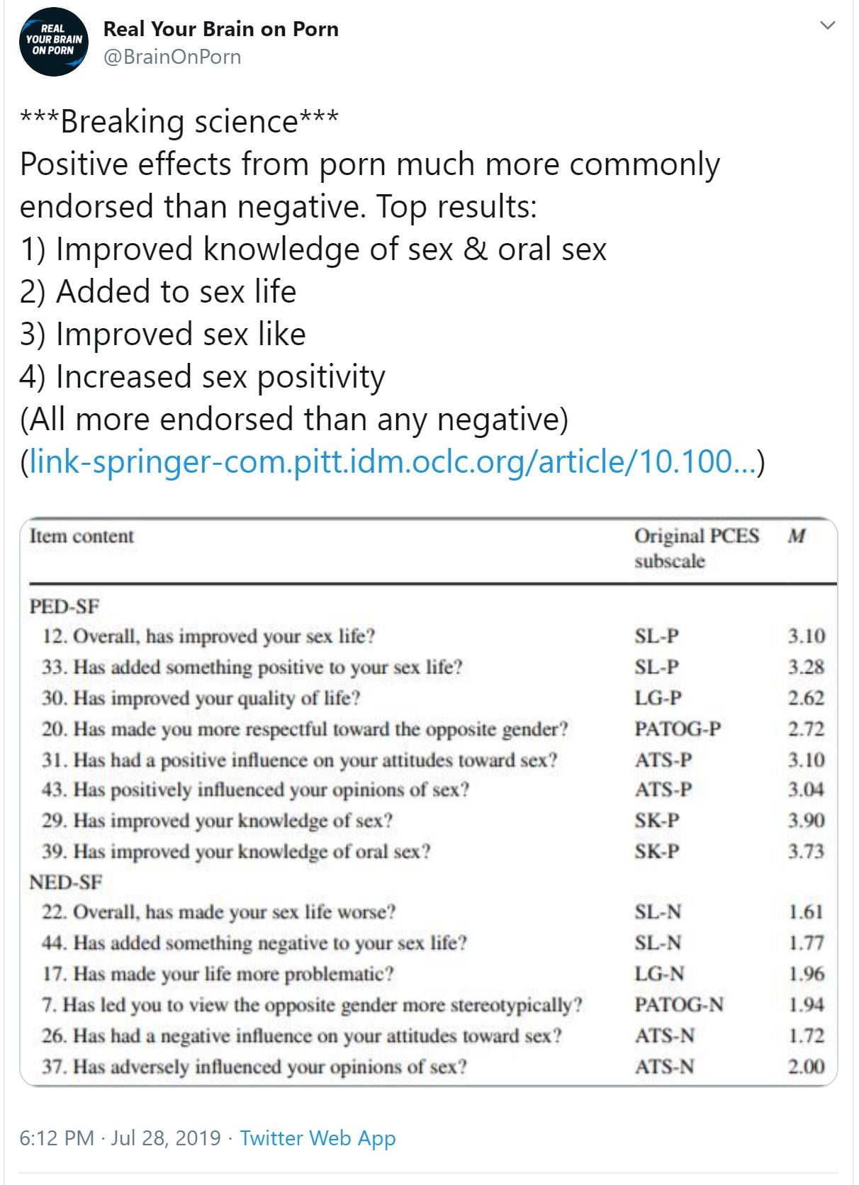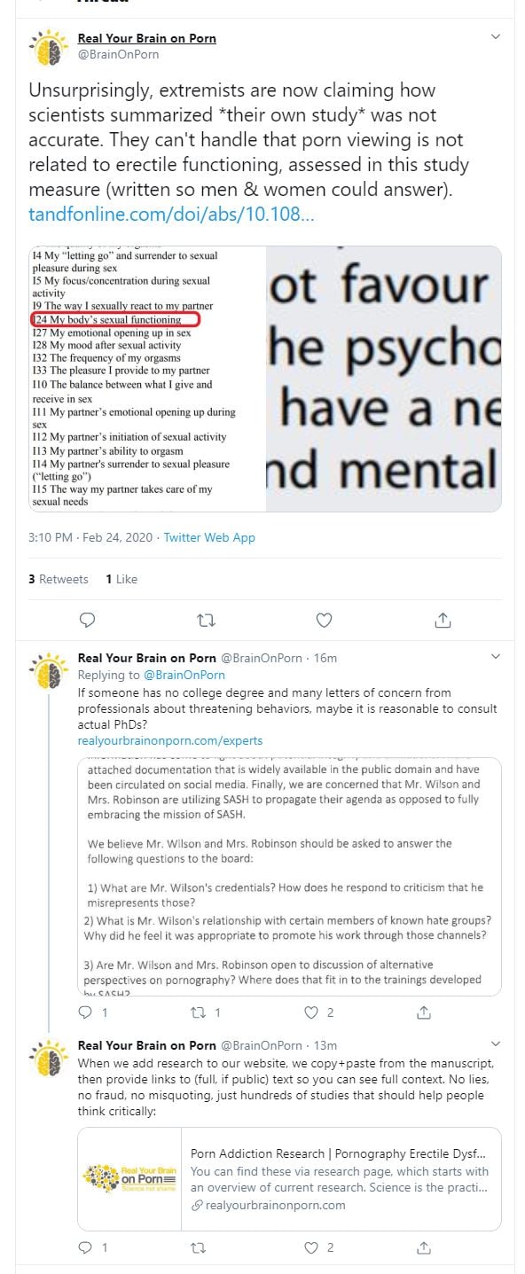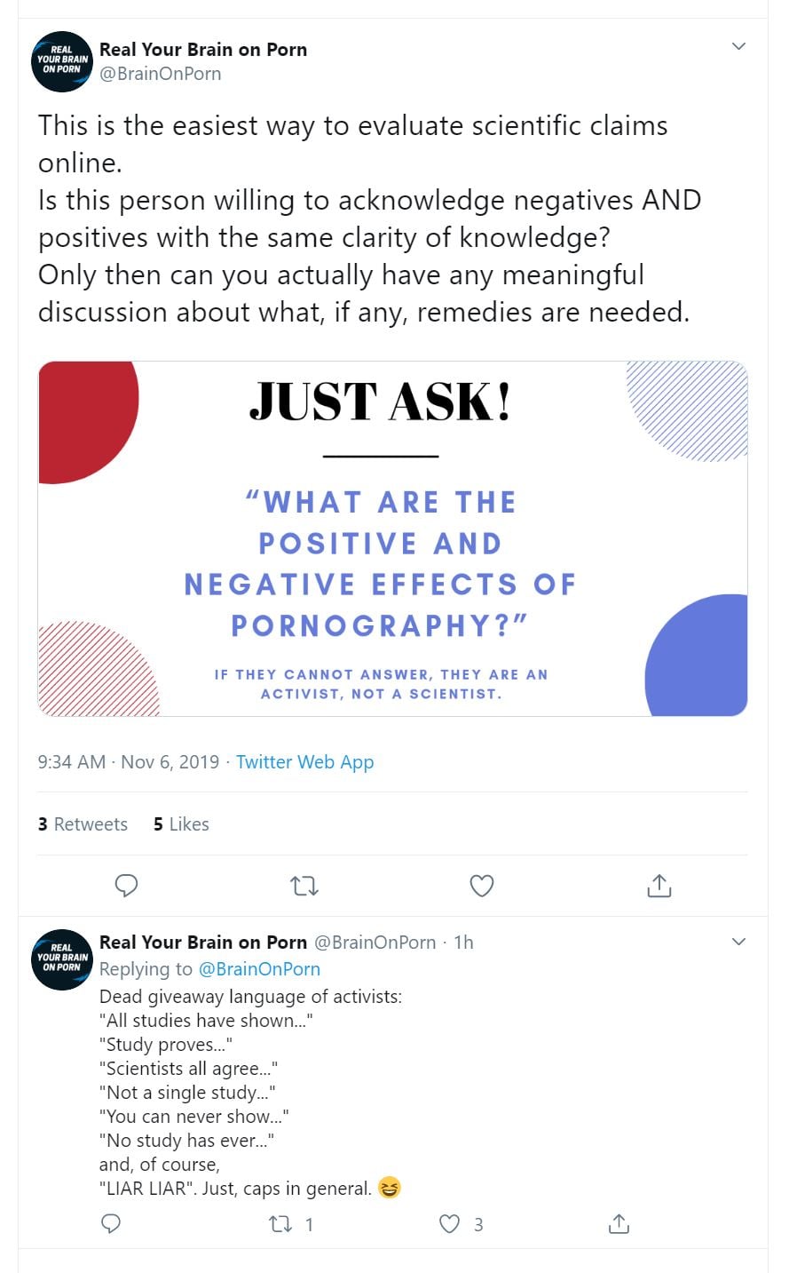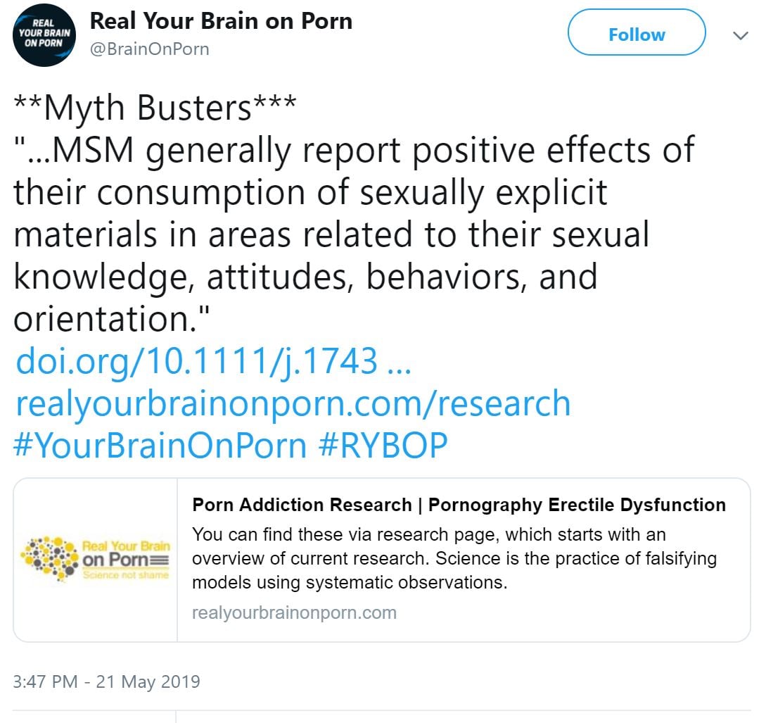 What a farce: the Twitter accounts for RealYBOP and Prause have never tweeted a single study reporting negative outcomes related to porn… even though the vast preponderance of pornography studies report negative outcomes. This alone exposes both accounts as promoting the porn industry’s agenda.