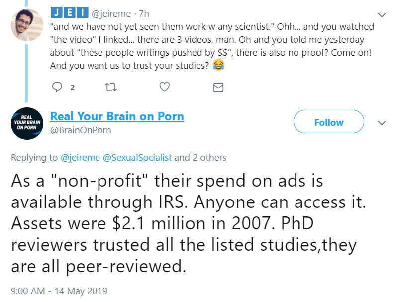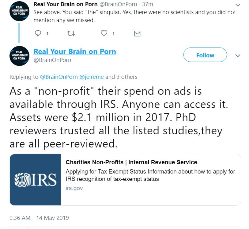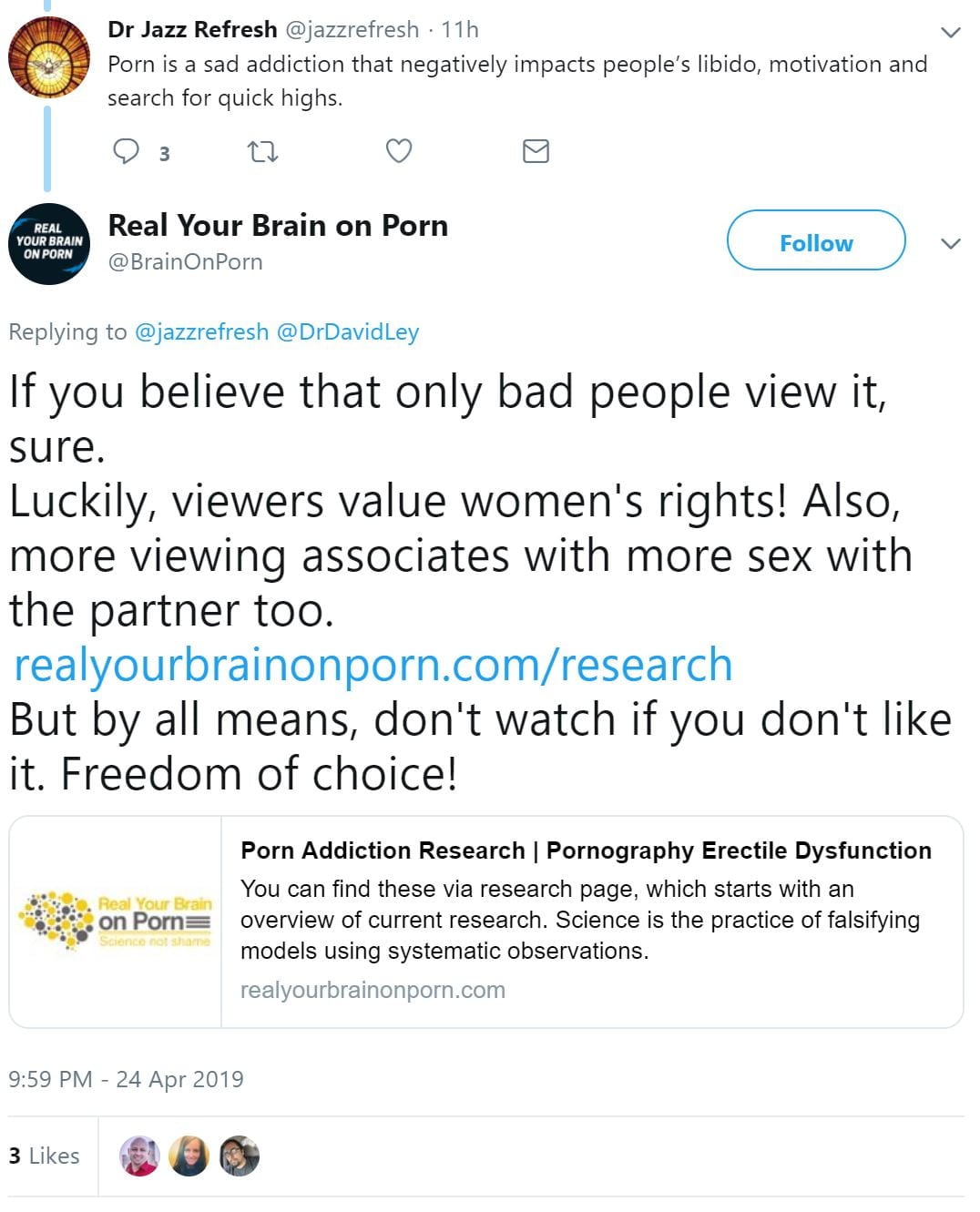 If you believe that RealYBOP isn’t biased, check out their tweets, or their so-called “research page”. RealYBOP has never once tweeted anything negative about porn use or the porn industry. Nada. Moreover, David Ley and two other RealYourBrainOnPorn.com “experts” (Justin Lehmiller and Chris Donaghue) are being paid to promote xHamster websites!