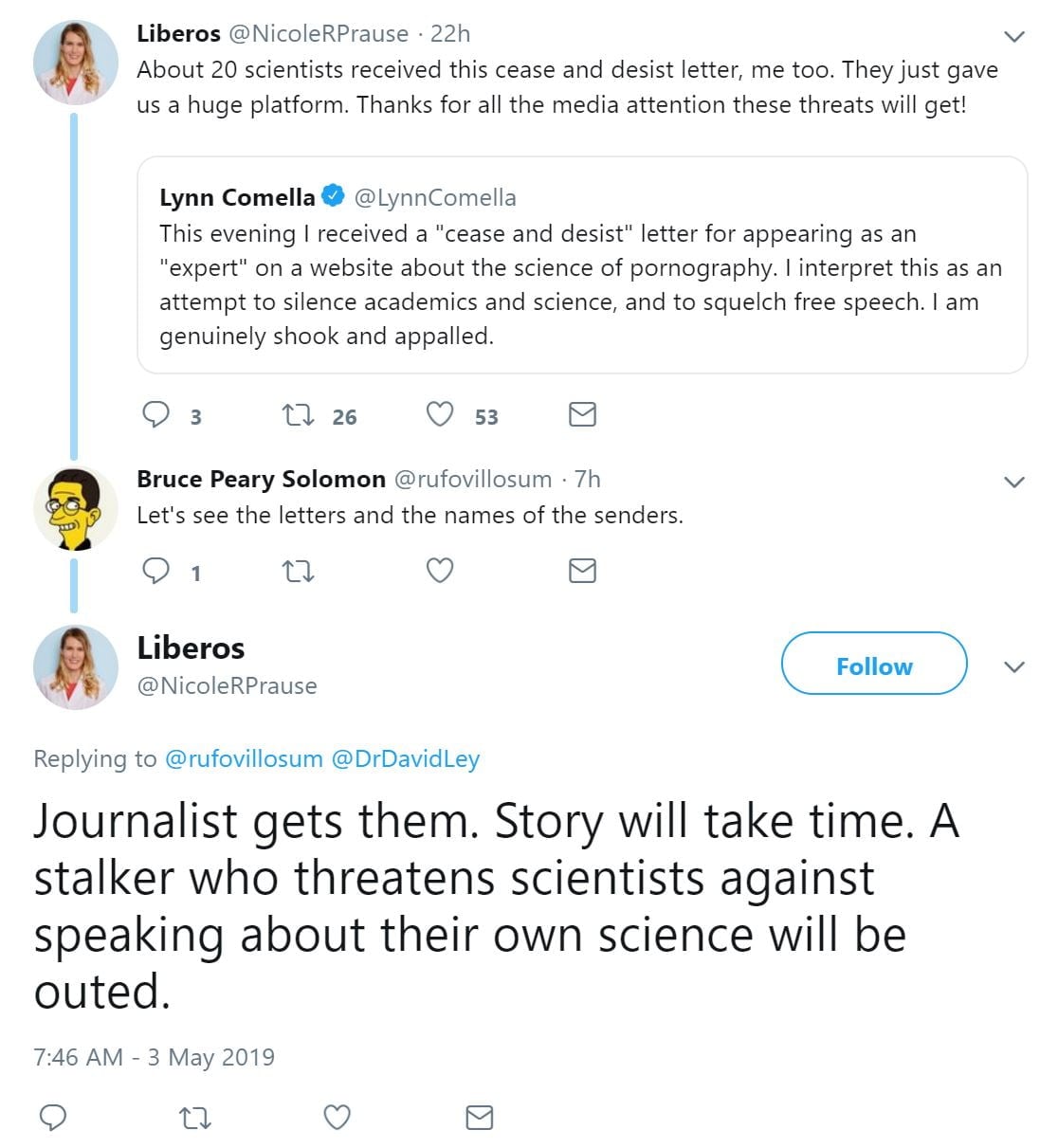 - October, 2018: Prause follows-up the “fascist” article by attacking & libeling Alexander Rhodes and Nofap.com on Twitter