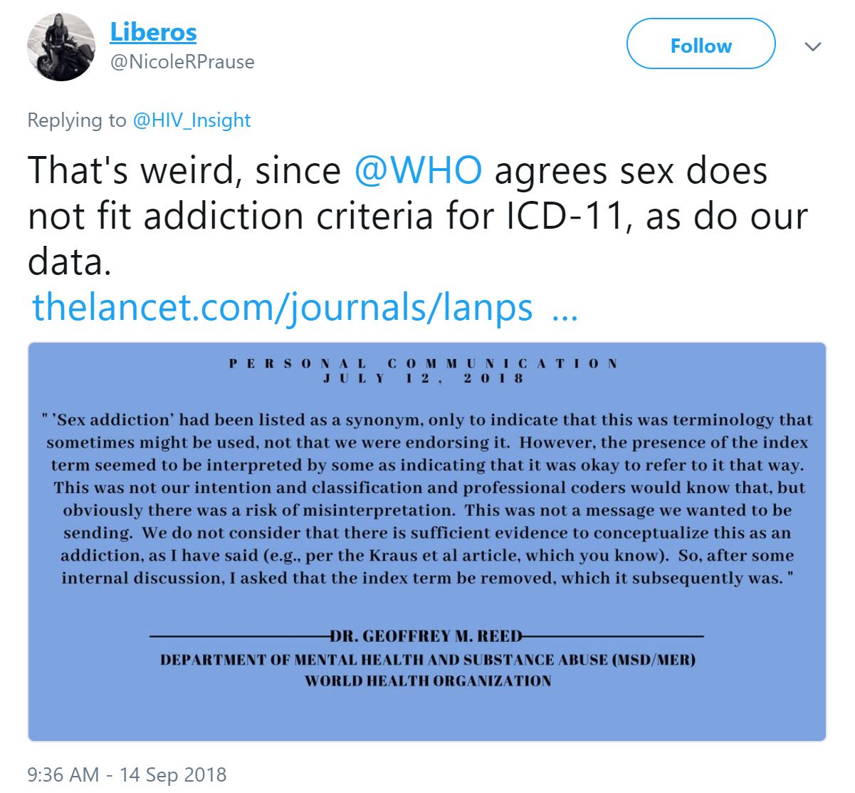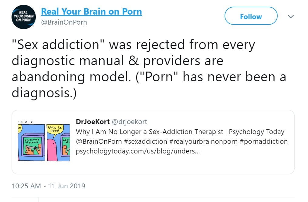 This tweet is by the person peddling a completely unproven and unapproved method for treating ‘sex addiction” – Transcranial Magnetic Stimulation (TMS). LOL.