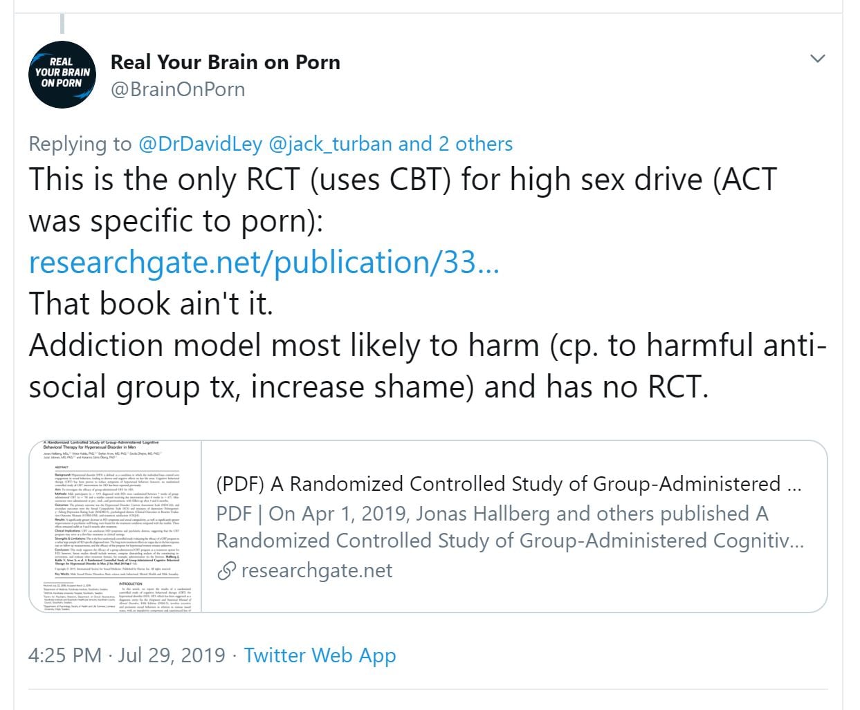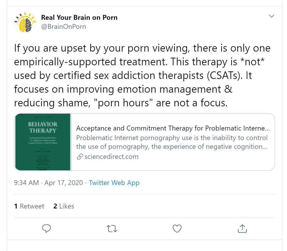 RealYBOP lies about CSAT’s, and lies about what treatments have been empirically supported. There isn’t only ONE treatment for porn/sex addiction. This recent meta-analysis says all treatments are pretty much equal (the most popular being CBT, not ACT as tweeted by RealYBOP). See – Treatments for internet addiction, sex addiction and compulsive buying: A meta-analysis