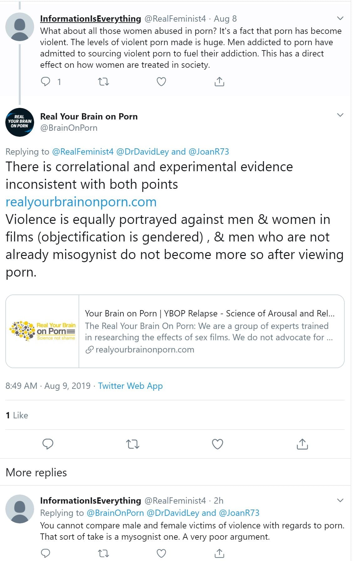 RealYBOP lies about an fMRI study (this was covered above), then attacks all of us who actually tweeted the FULL conclusion section of the study. Then she rambles on about the anti-porn extremists – the ones who actual excerpt the study, instead of lying about what the authors concluded.