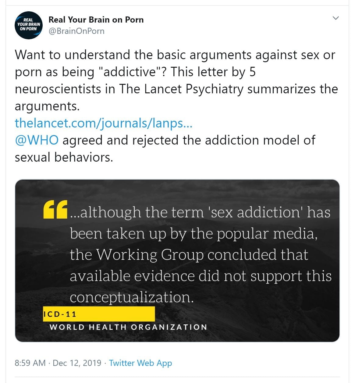 The fact is, the deniers are out of step with the experts who drafted the world’s most widely used medical diagnostic manual, The International Classification of Diseases (ICD-11). The porn industry is well served by a group of purported “experts” who boldly misrepresent the balance of existing research and ignore the preponderance of the research. The latter undercuts the new site’s agenda by pointing to measurable harms associated with porn overuse.