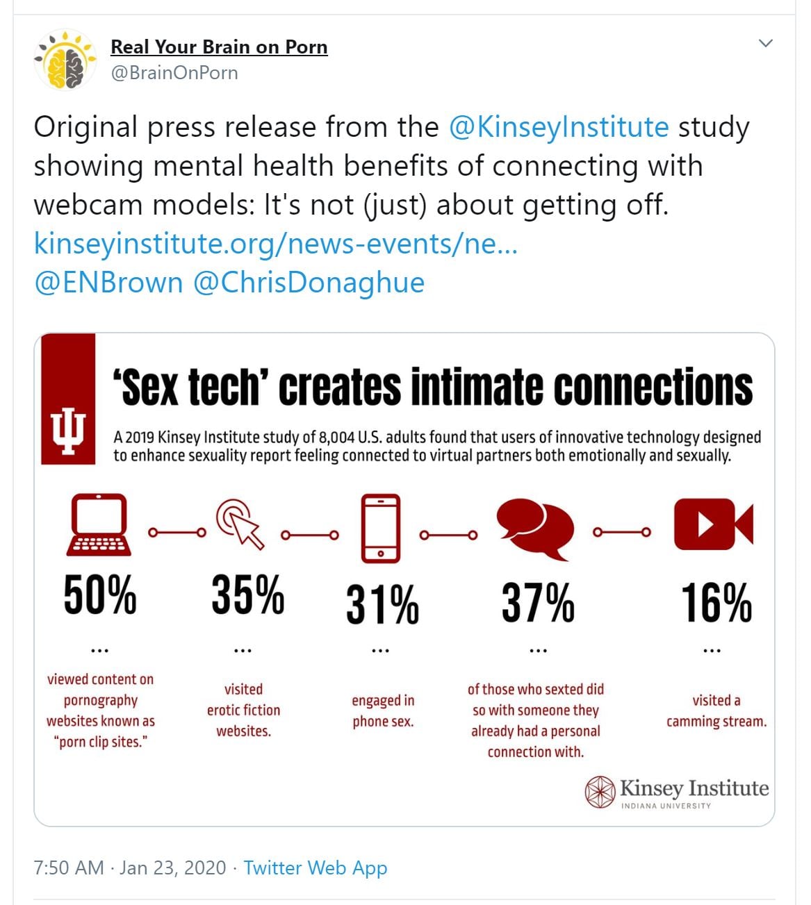 The official StripChat Twitter account reveals the true reason for paying SHA “experts”: to soothe their anxieties to prevent the loss of paying customers. The SHA will accomplish this by “talking about the latest research on sex, camming and addiction,” that is, cherry picking the work done by “their” researchers. Will Ley/SHA mention that hundreds of studies link porn use to myriad negative effects?