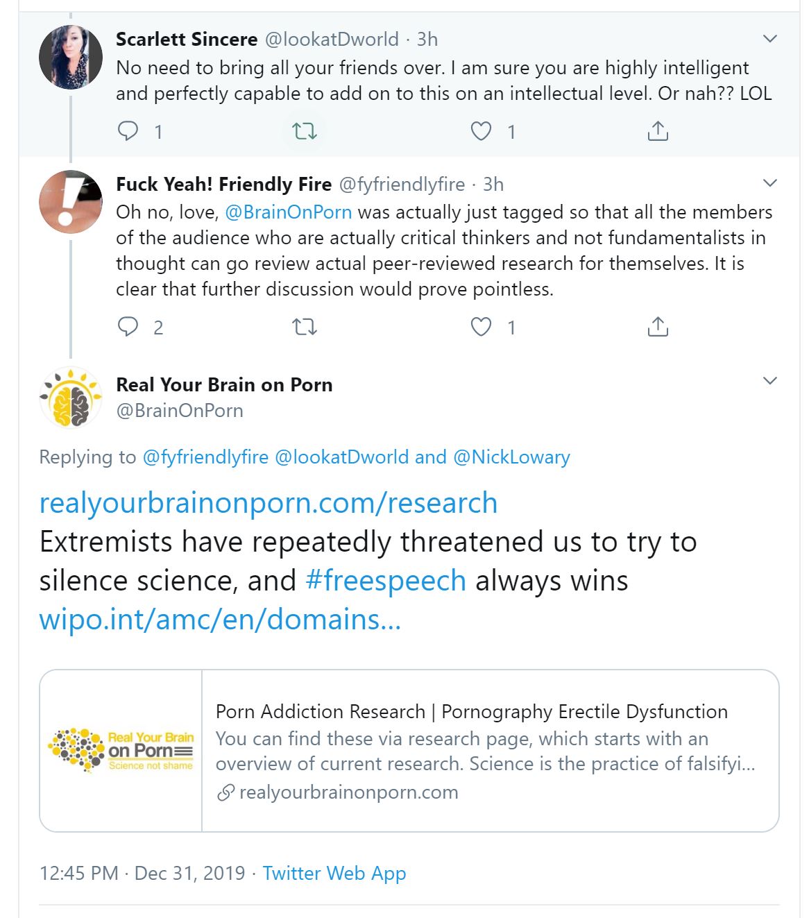 - October, 2019: RealYBOP twitter (Prause & Daniel Burgess) defame Alex Rhodes & Gabe Deem, falsely claiming both tried to “take down” realyourbrainonporn.com.