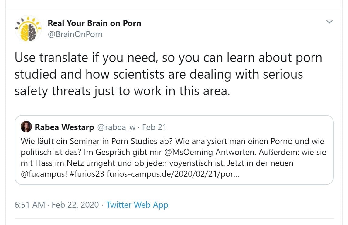 Madita Oeming is a member of RealYBOP expert page & close ally of Prause. The title of her upcoming PhD is “porn addiction as moral panic”.