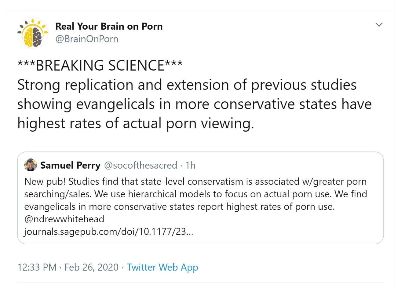 Numerous studies have debunked claims that religious people watch more porn – Religious People Use Less Porn and Are No More Likely to Believe They Are Addicted (2017). Perry trying to squeeze a sideways correlation out of faulty data (he didn’t even have frequency of porn use!).