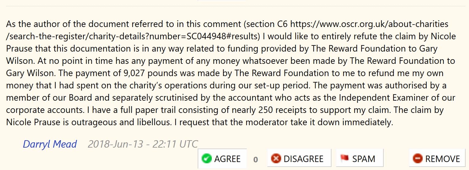 Gary Wilson comment: NeuroSex linked to a redacted document, claiming that Gary Wilson was paid 9,000 pounds by Scottish charity The Reward Foundation. Two days earlier Prause falsely claimed to journal publisher MDPI (and others) that, based on the charity’s recent public filing (with a name redacted, as is standard), expense reimbursements paid to a charity officer were in fact paid to Wilson. Prause has not checked her facts, and she is mistaken (again). Wilson has never received any money from The Reward Foundation. Prause has repeated this same lie elsewhere.