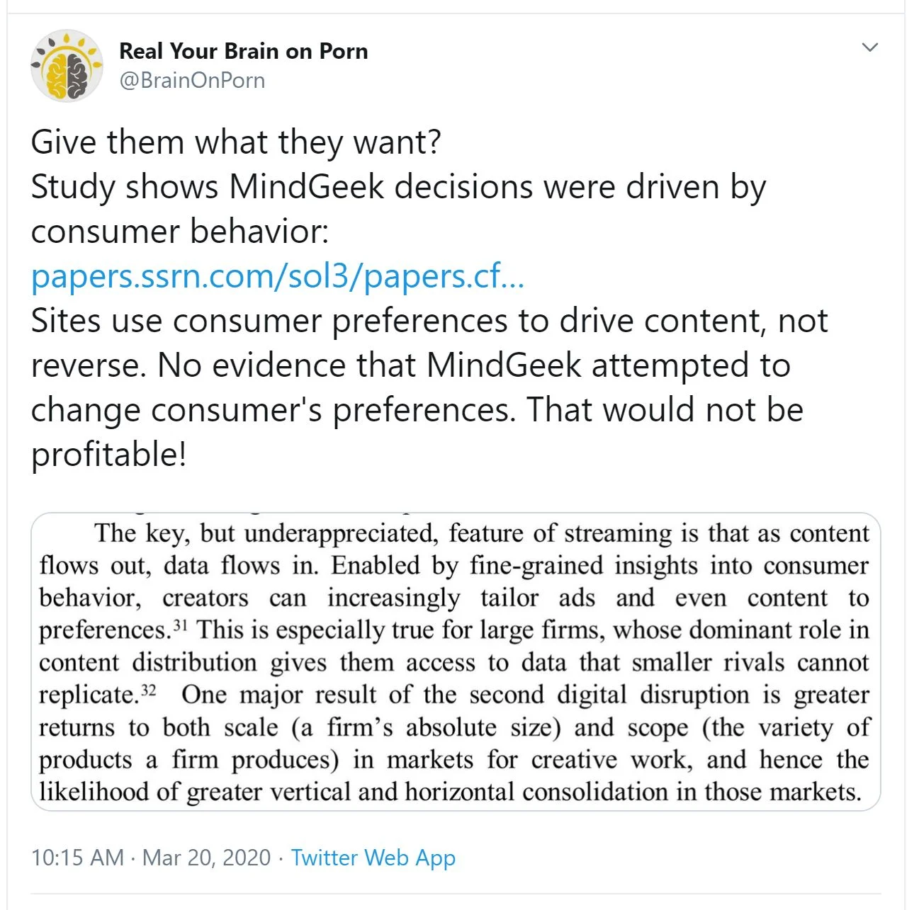 While Daniel Burgess is the last known owner of the RealYBOP URL (www.RealYourBrainOnPorn.com), the most credible evidence points towards Nicole Prause creating and operating the RealYBOP website and Twitter account. @BrainOnPorn’s 18-month reign of terror ended with Twitter permanently banning it for targeted harassment and posting its victims personal information. Around this same time YBOP acquired www.RealYourBrainOnPorn.com in trademark infringement settlement.