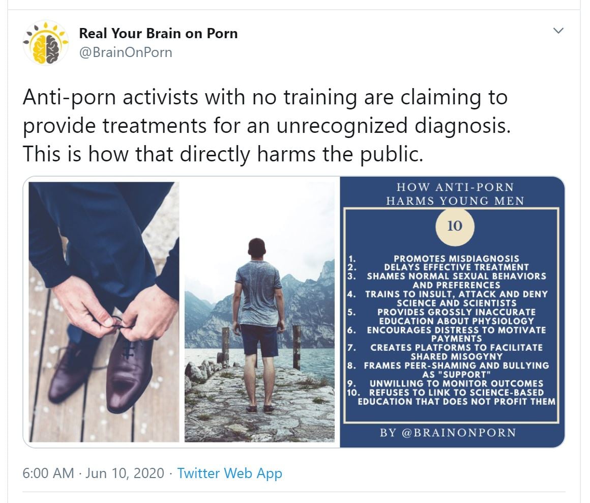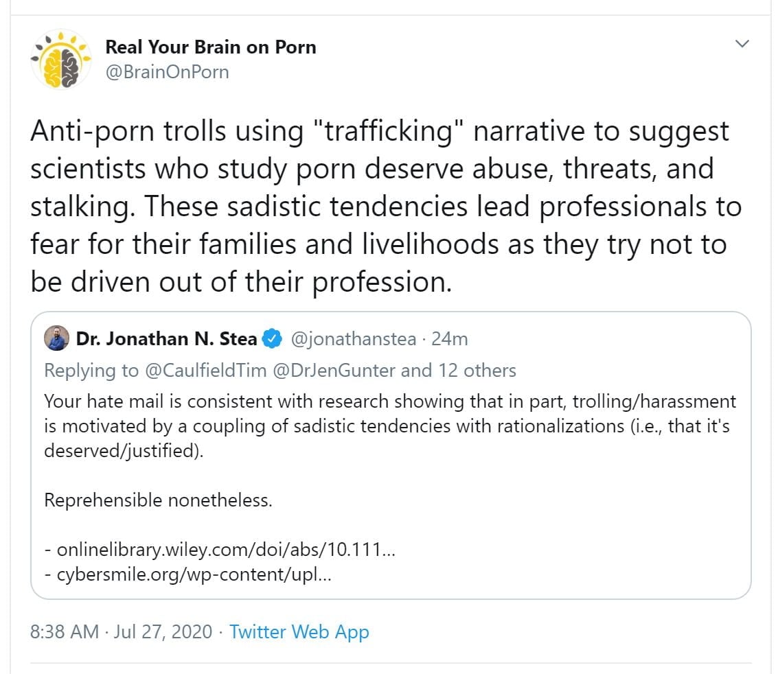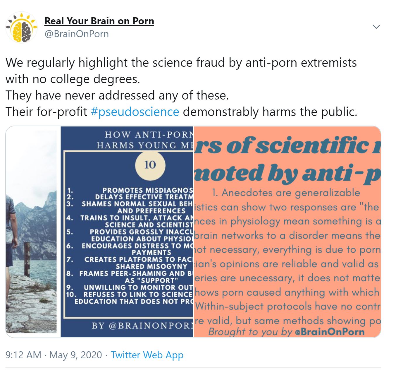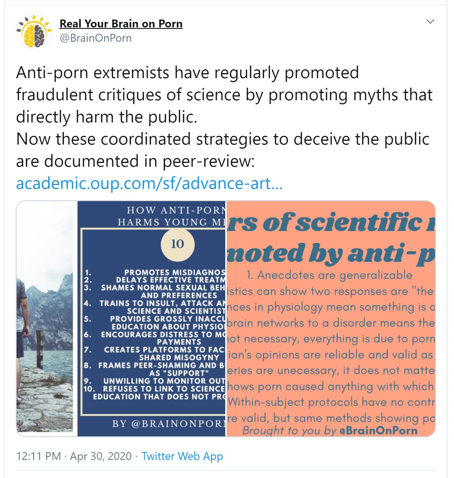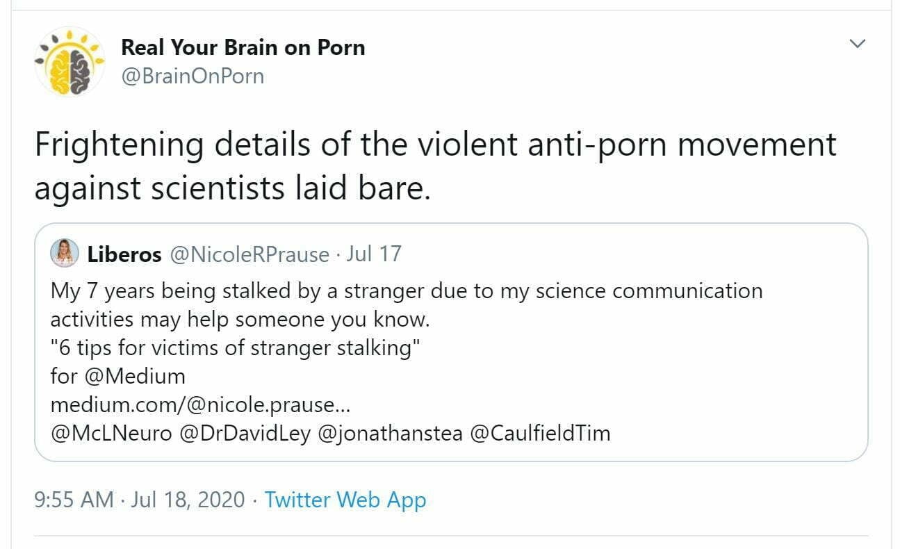 NOTE: In September, 2020 @BrainOnPorn attempted to rebrand itself as a commentary-on-YBOP account, but without commenting on the content of YBOP! Instead, Prause used Anti-Your Brain On Porn (@BrainOnPorn) solely to defame and lie about various individuals and organizations (approximately 1000 such tweets in the first 16 months of its existence). It cyberstalked my son and his mother, tweeting where they worked and lived, while defaming both in the most vile manner. @BrainOnPorn supplied no actual commentary or analysis. Many RealYBOP tweets have been omitted because they are too vile and defamatory.