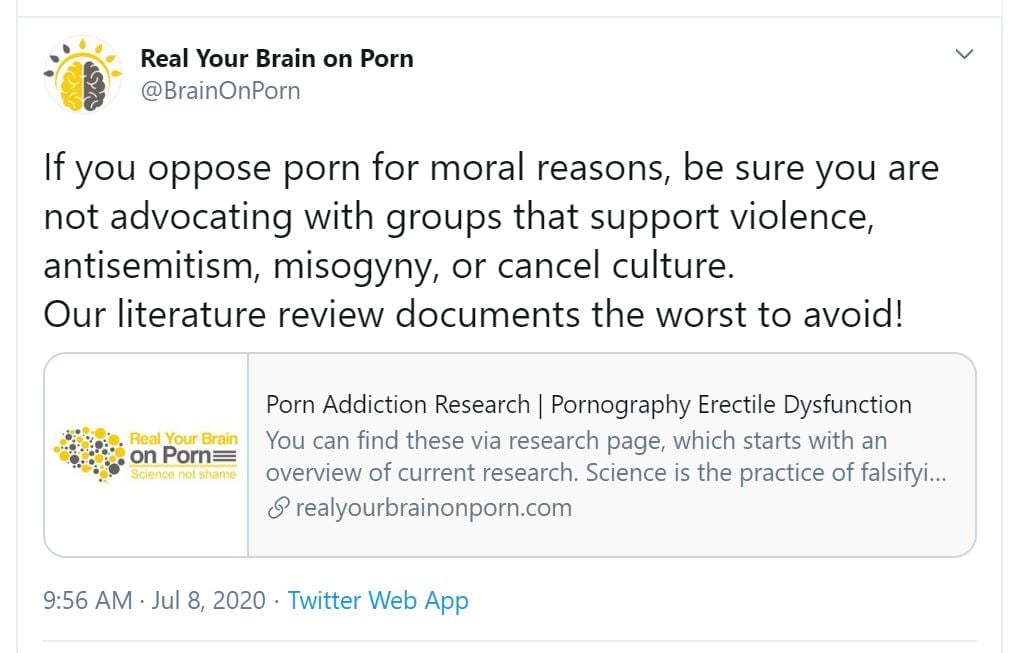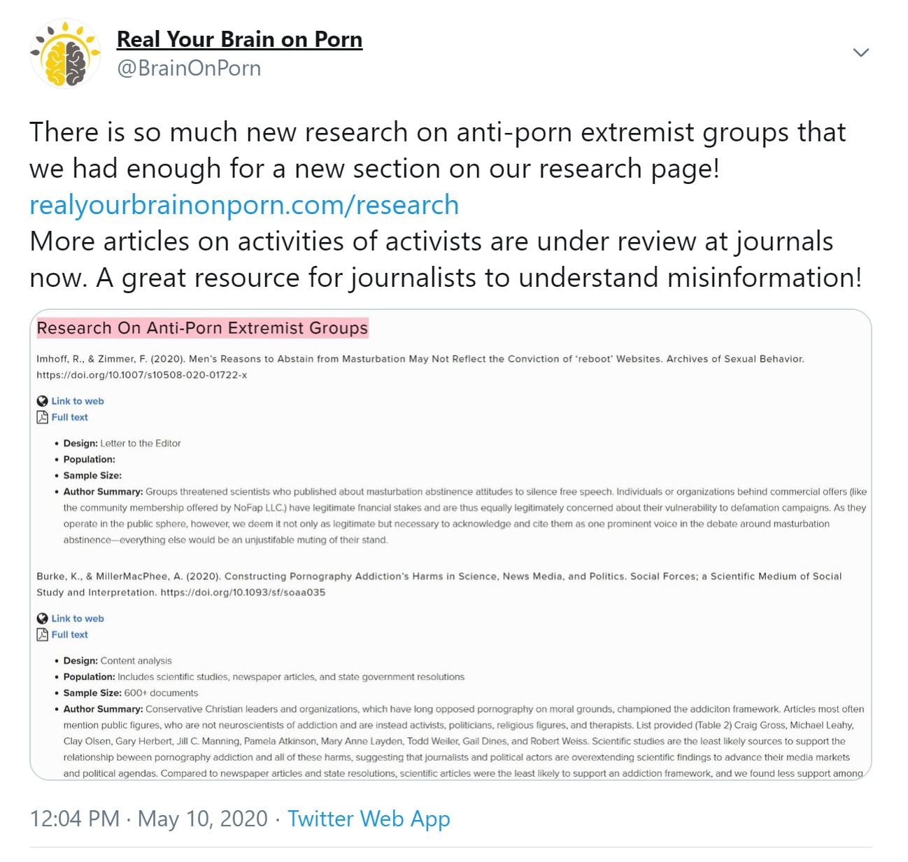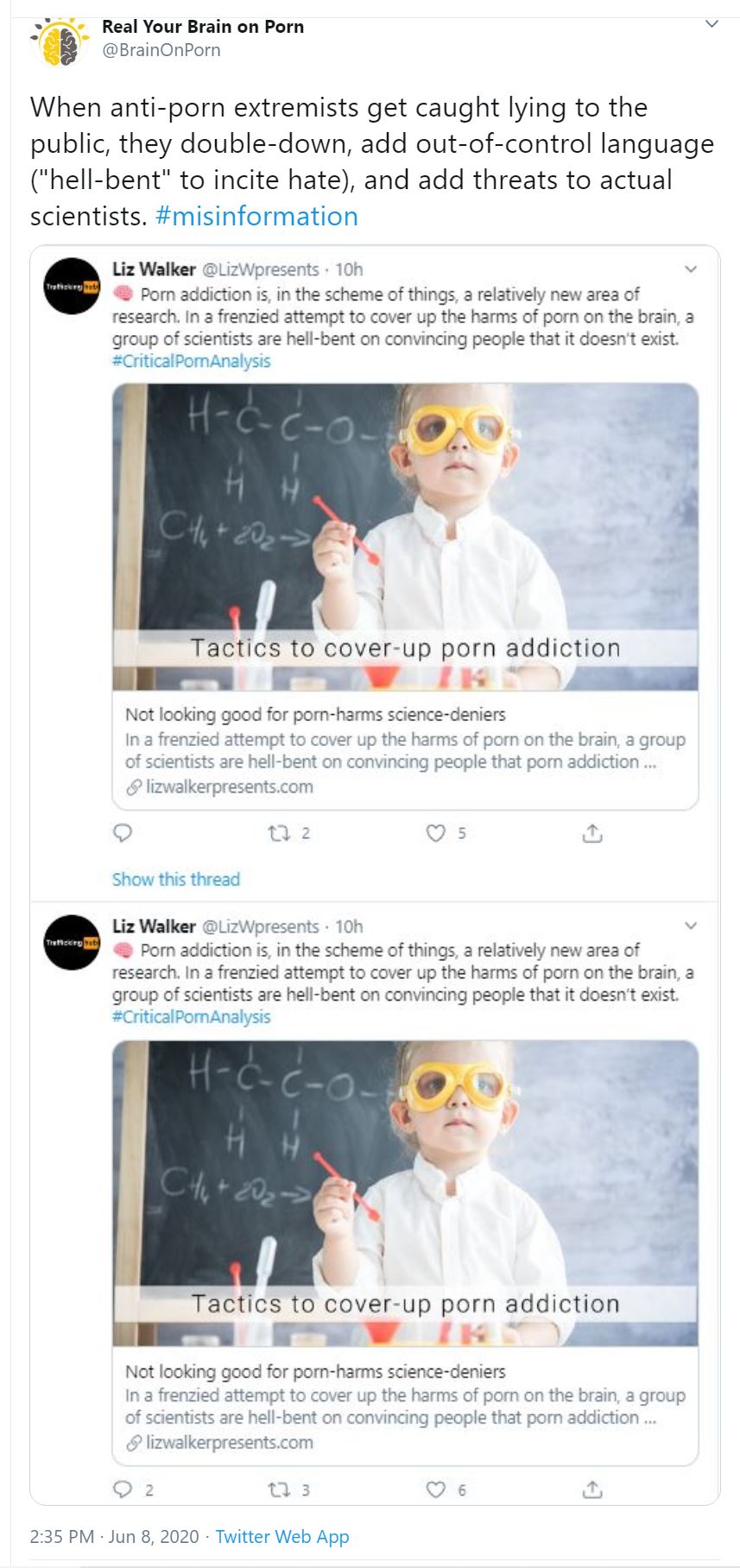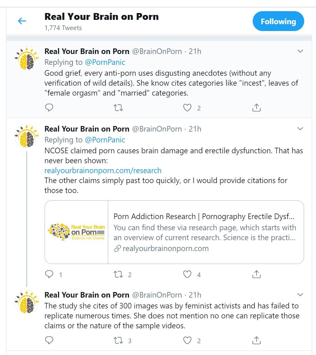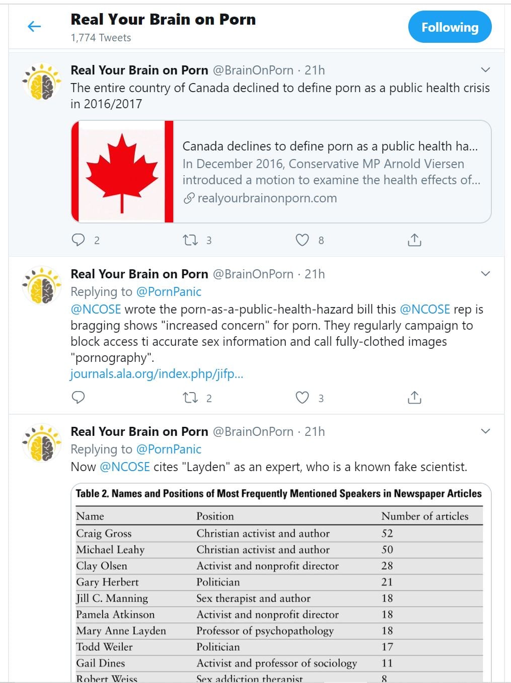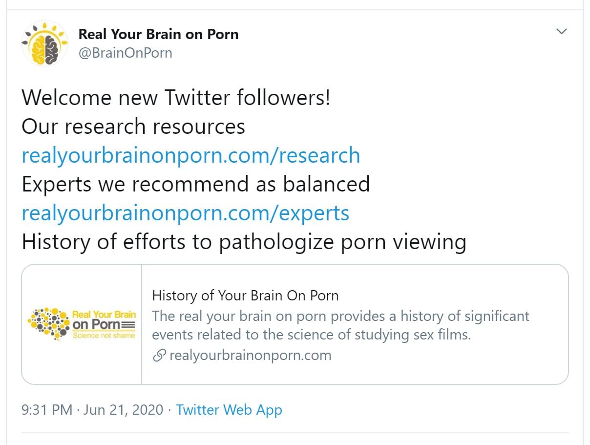 NOTE: In September, 2020 @BrainOnPorn attempted to rebrand itself as a commentary-on-YBOP account, but without commenting on the content of YBOP! Instead, Prause used Anti-Your Brain On Porn (@BrainOnPorn) solely to defame and lie about various individuals and organizations (approximately 1000 such tweets in the first 16 months of its existence). It cyberstalked my son and his mother, tweeting where they worked and lived, while defaming both in the most vile manner. @BrainOnPorn supplied no actual commentary or analysis. Many RealYBOP tweets have been omitted because they are too vile and defamatory.