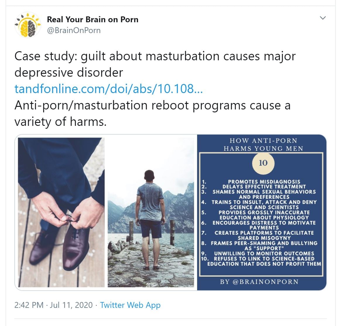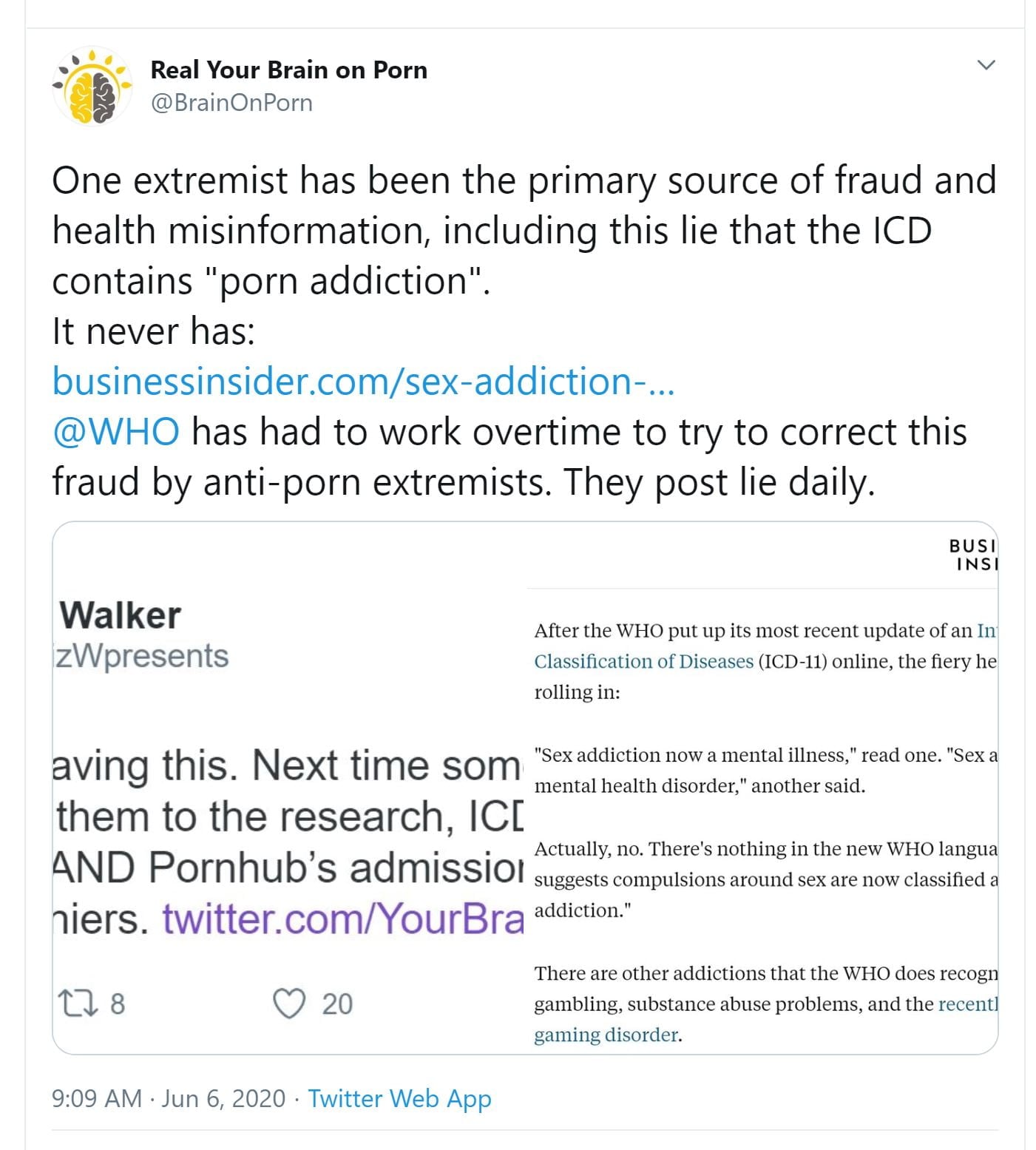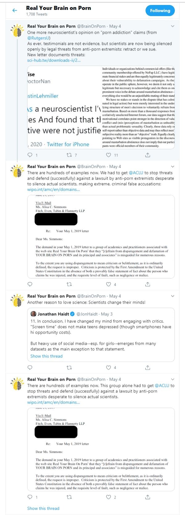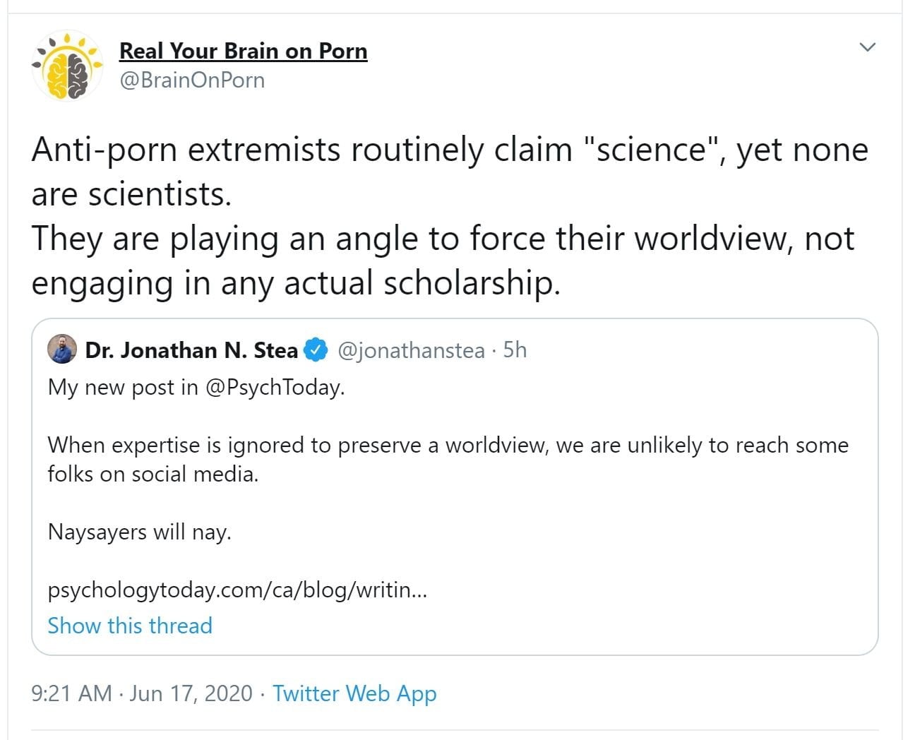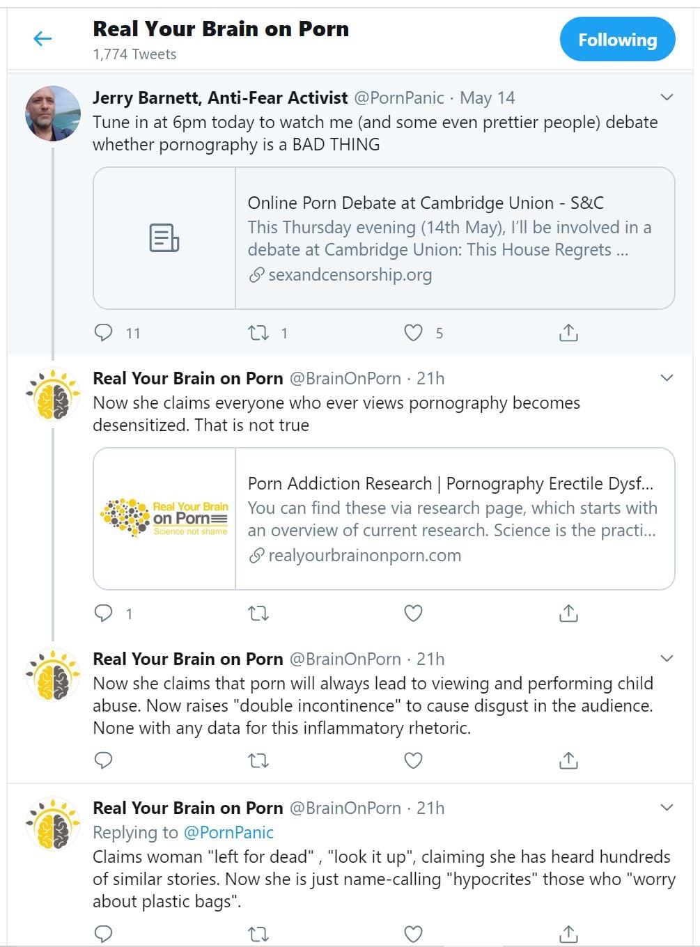 NOTE: In September, 2020 @BrainOnPorn attempted to rebrand itself as a commentary-on-YBOP account, but without commenting on the content of YBOP! Instead, Prause used Anti-Your Brain On Porn (@BrainOnPorn) solely to defame and lie about various individuals and organizations (approximately 1000 such tweets in the first 16 months of its existence). It cyberstalked my son and his mother, tweeting where they worked and lived, while defaming both in the most vile manner. @BrainOnPorn supplied no actual commentary or analysis. Many RealYBOP tweets have been omitted because they are too vile and defamatory.