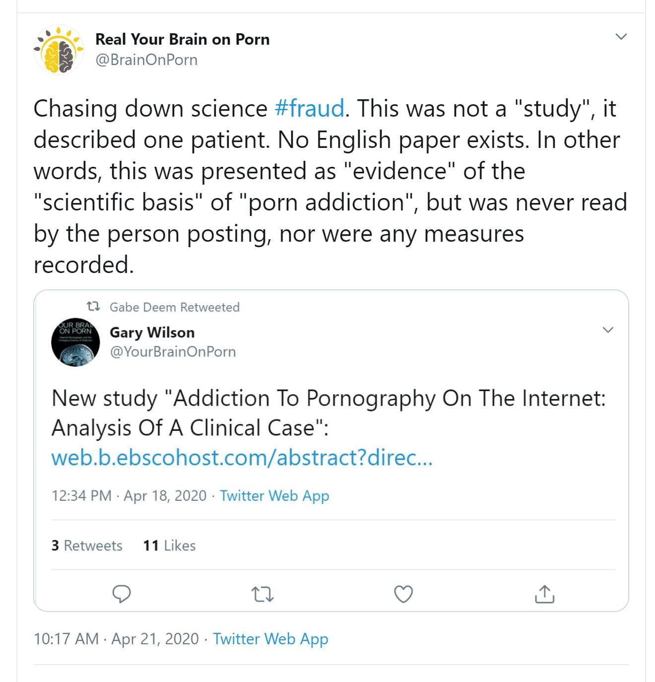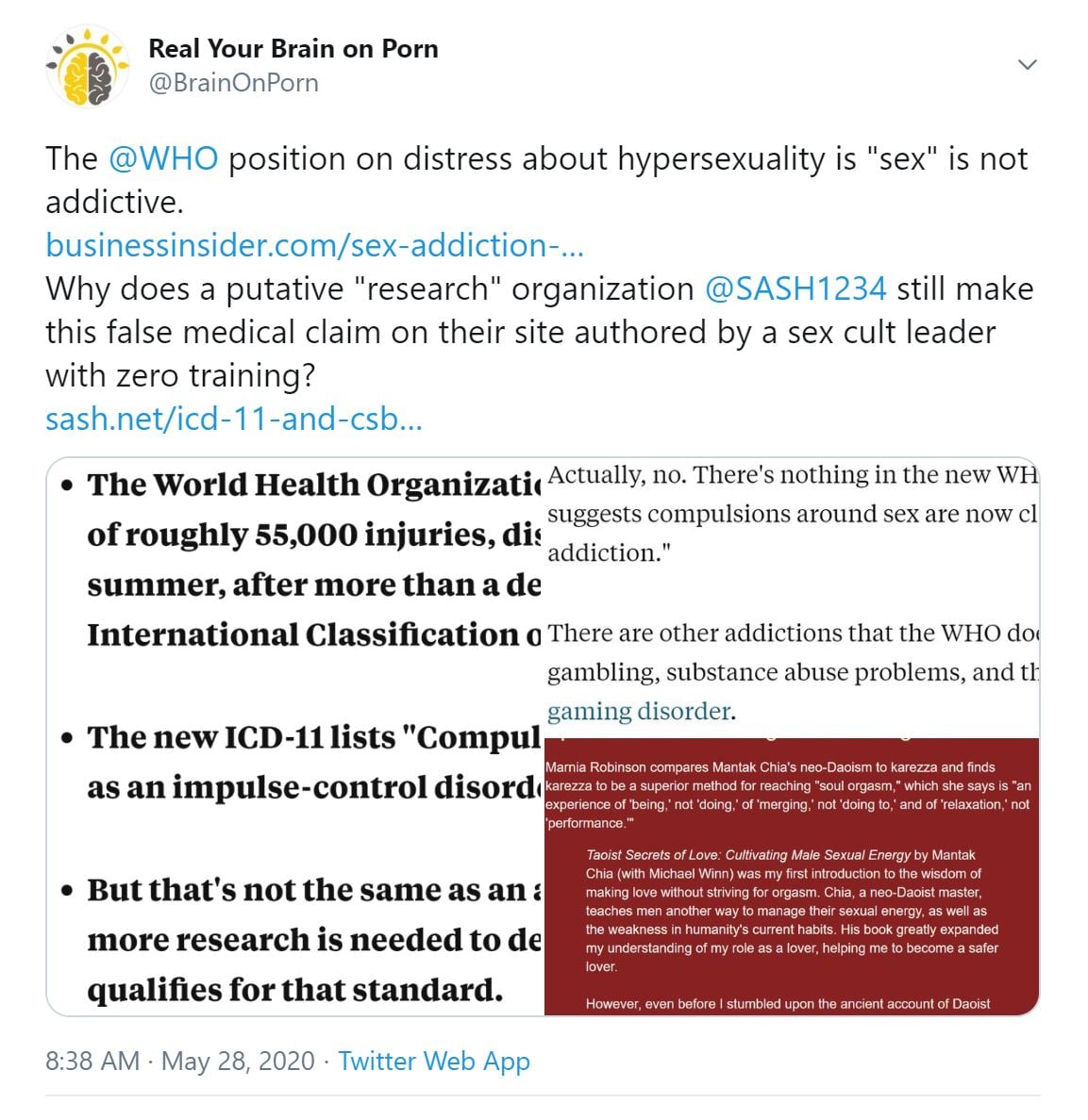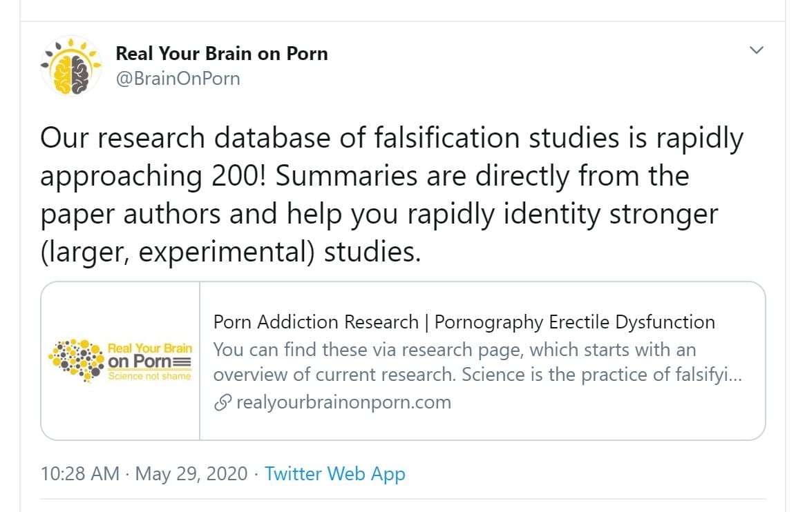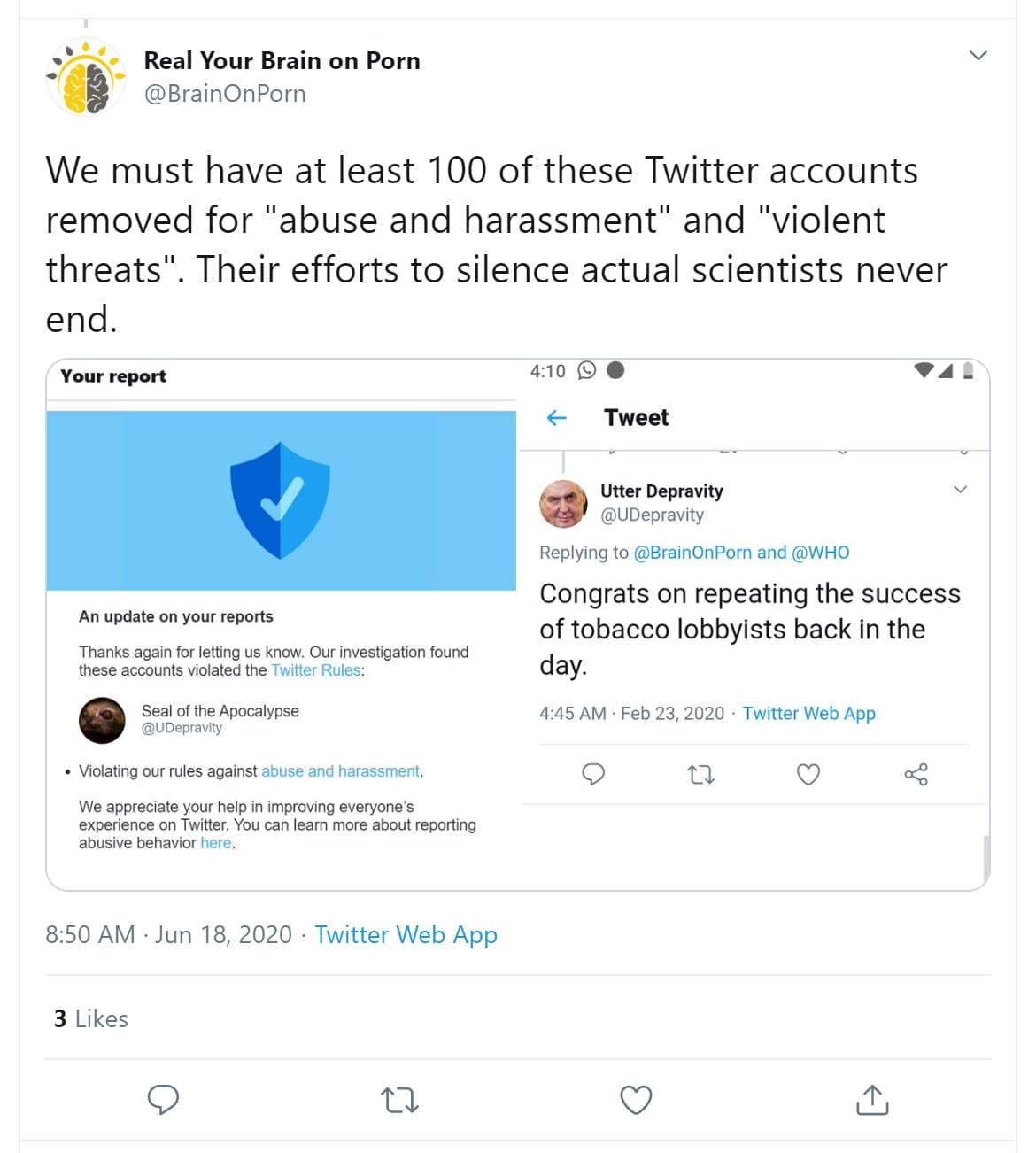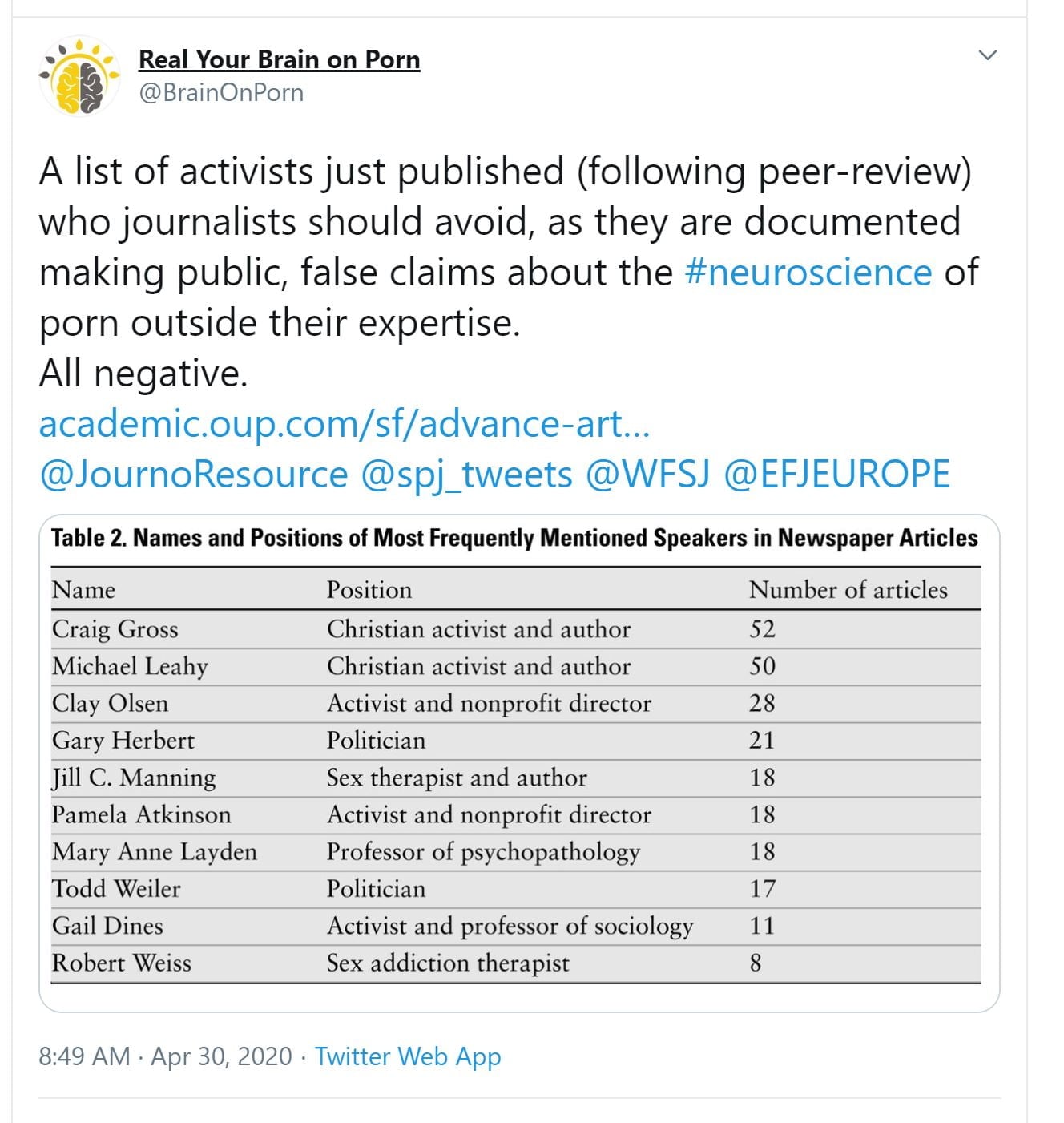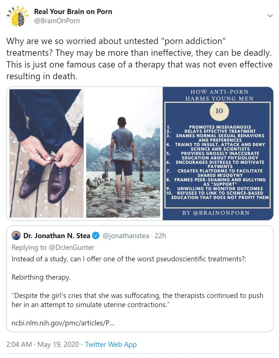NOTE: In September, 2020 @BrainOnPorn attempted to rebrand itself as a commentary-on-YBOP account, but without commenting on the content of YBOP! Instead, Prause used Anti-Your Brain On Porn (@BrainOnPorn) solely to defame and lie about various individuals and organizations (approximately 1000 such tweets in the first 16 months of its existence). It cyberstalked my son and his mother, tweeting where they worked and lived, while defaming both in the most vile manner. @BrainOnPorn supplied no actual commentary or analysis. Many RealYBOP tweets have been omitted because they are too vile and defamatory.
