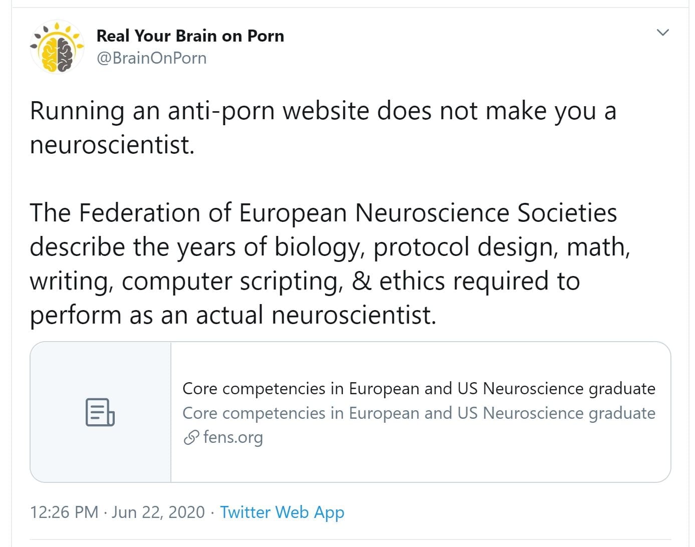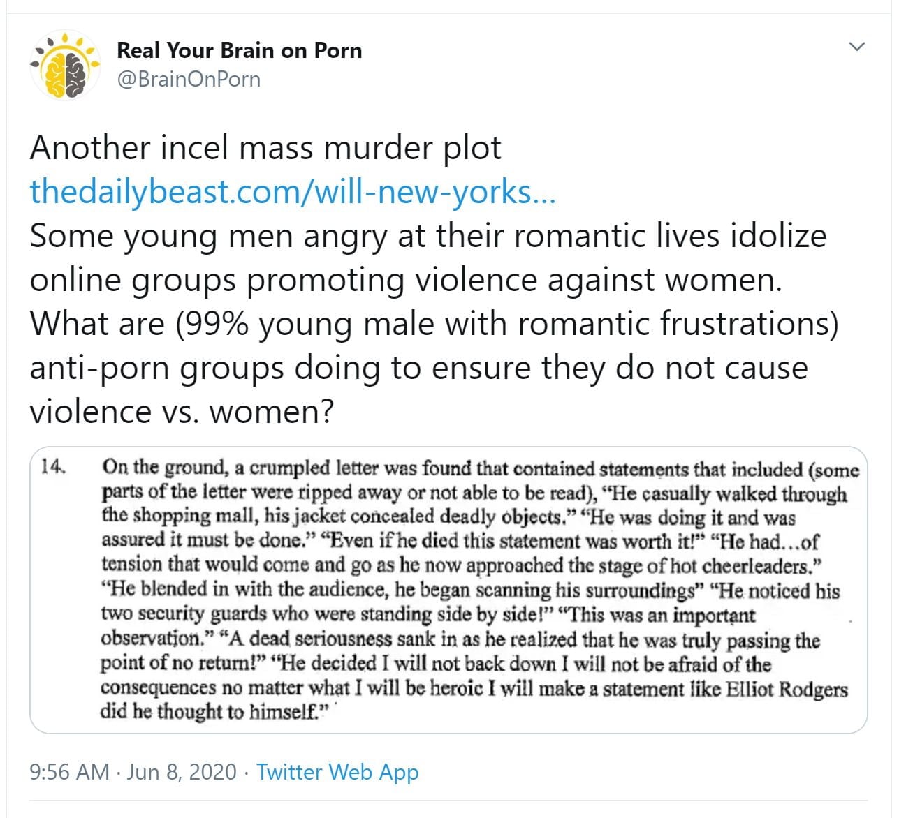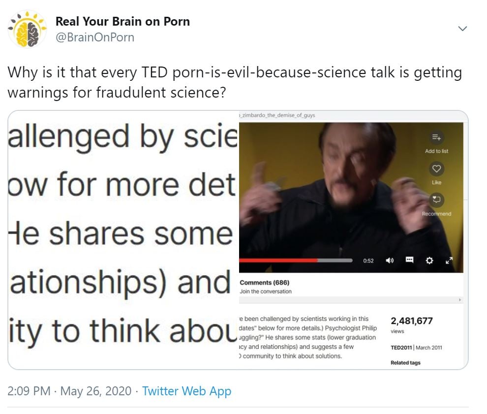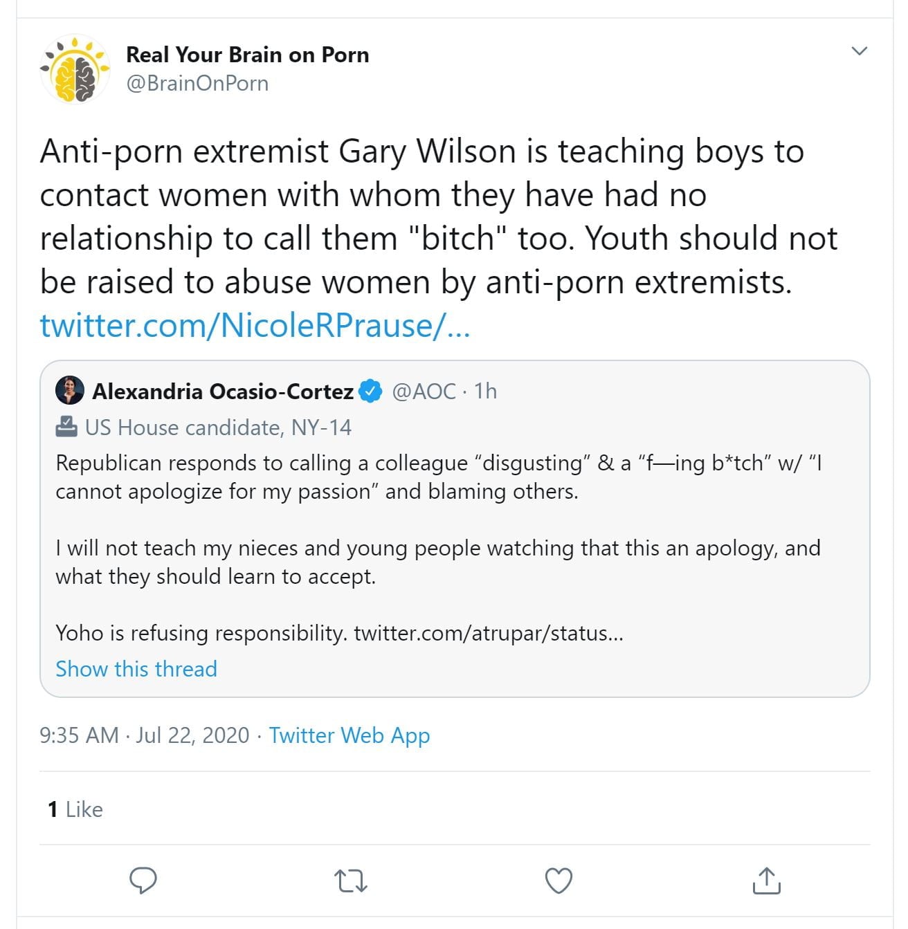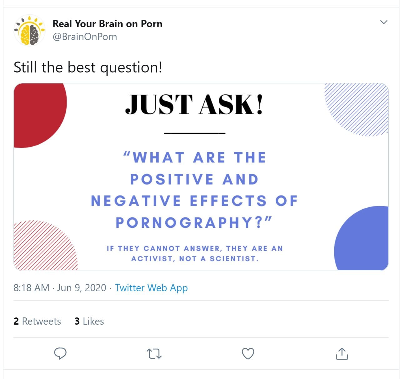 NOTE: In September, 2020 @BrainOnPorn attempted to rebrand itself as a commentary-on-YBOP account, but without commenting on the content of YBOP! Instead, Prause used Anti-Your Brain On Porn (@BrainOnPorn) solely to defame and lie about various individuals and organizations (approximately 1000 such tweets in the first 16 months of its existence). It cyberstalked my son and his mother, tweeting where they worked and lived, while defaming both in the most vile manner. @BrainOnPorn supplied no actual commentary or analysis. Many RealYBOP tweets have been omitted because they are too vile and defamatory.