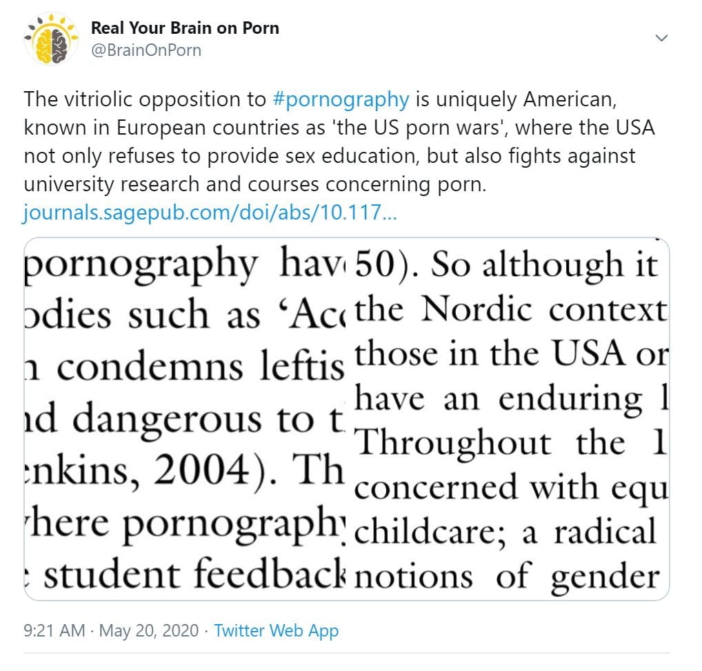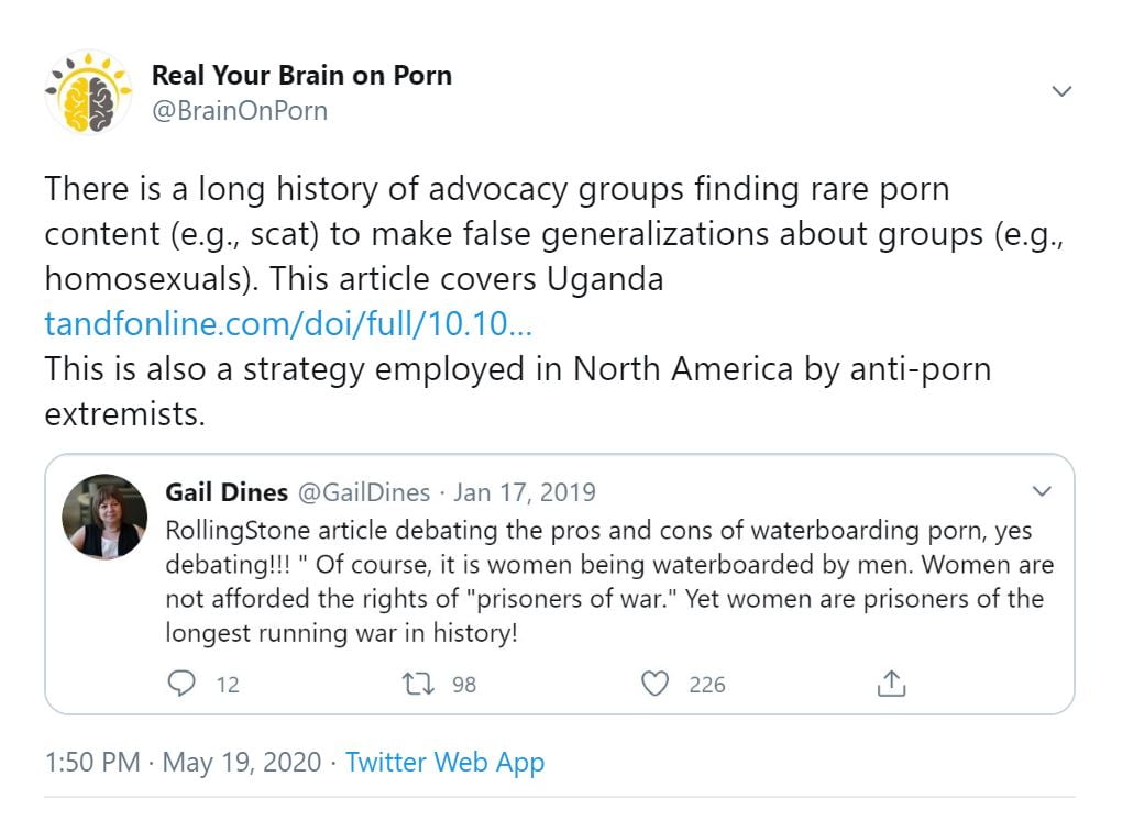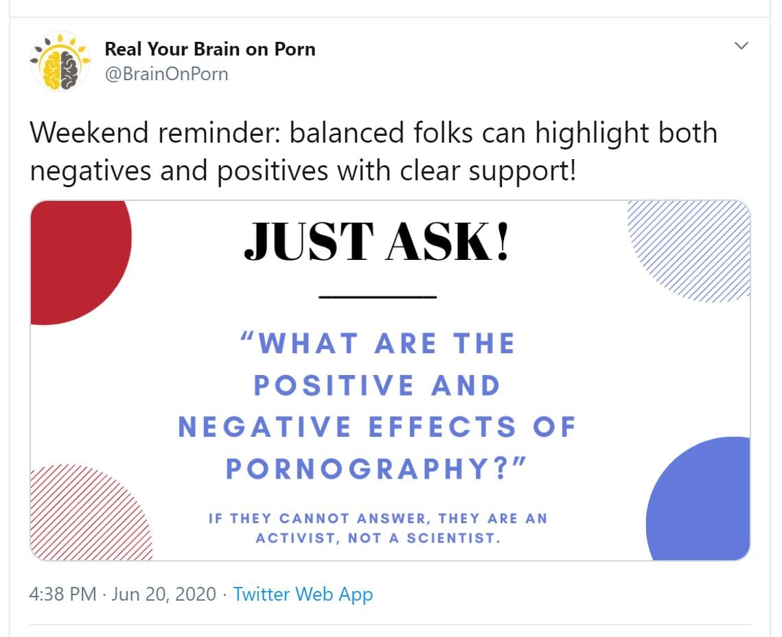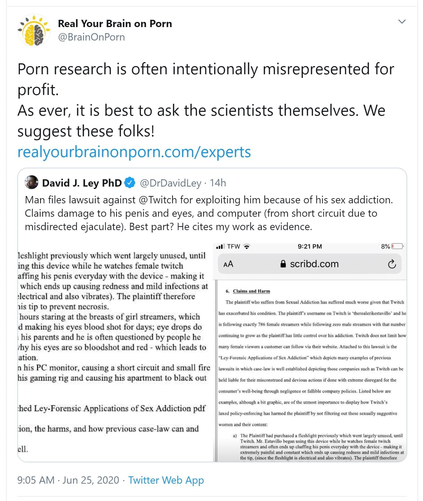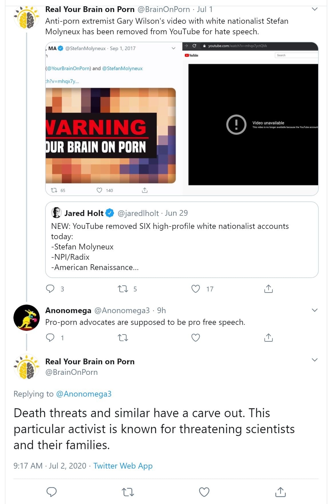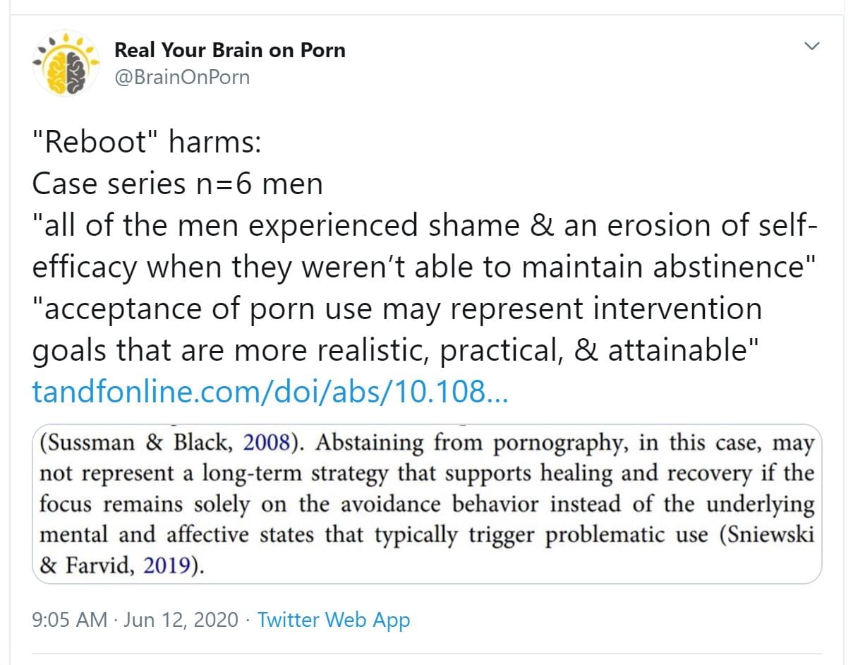 NOTE: In September, 2020 @BrainOnPorn attempted to rebrand itself as a commentary-on-YBOP account, but without commenting on the content of YBOP! Instead, Prause used Anti-Your Brain On Porn (@BrainOnPorn) solely to defame and lie about various individuals and organizations (approximately 1000 such tweets in the first 16 months of its existence). It cyberstalked my son and his mother, tweeting where they worked and lived, while defaming both in the most vile manner. @BrainOnPorn supplied no actual commentary or analysis. Many RealYBOP tweets have been omitted because they are too vile and defamatory.