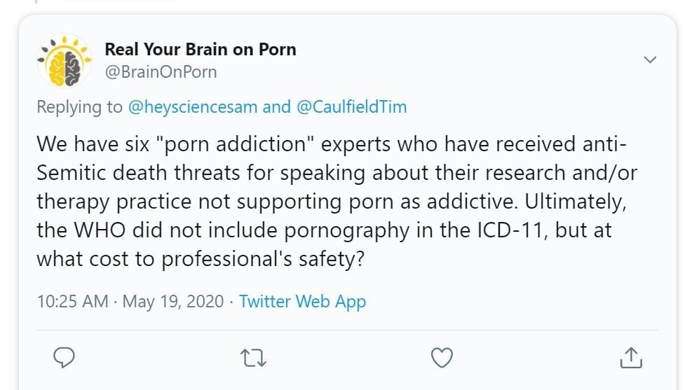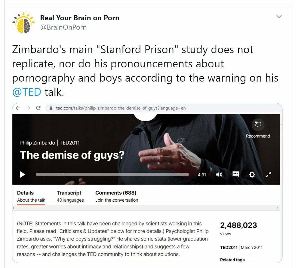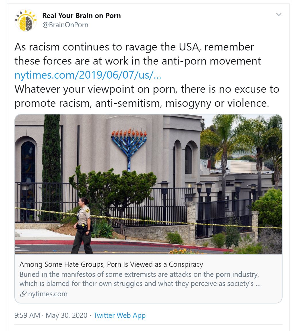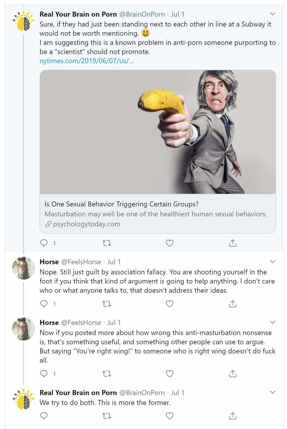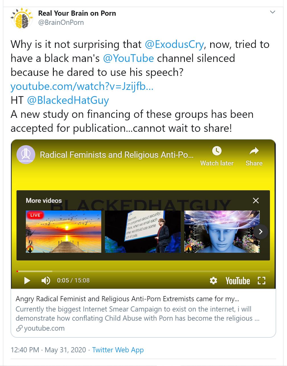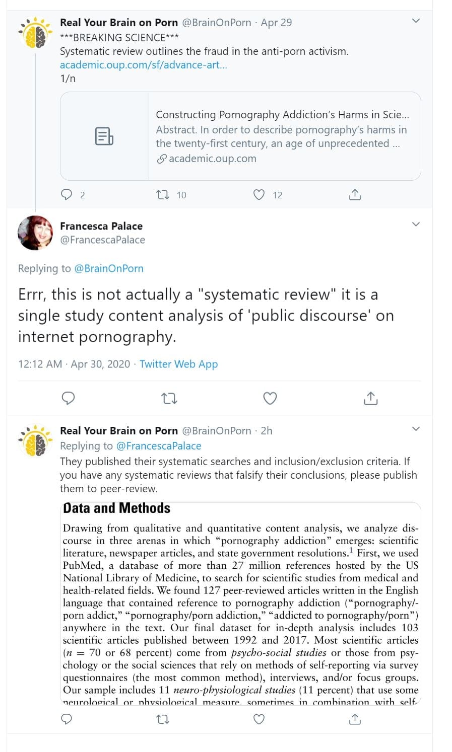NOTE: In September, 2020 @BrainOnPorn attempted to rebrand itself as a commentary-on-YBOP account, but without commenting on the content of YBOP! Instead, Prause used Anti-Your Brain On Porn (@BrainOnPorn) solely to defame and lie about various individuals and organizations (approximately 1000 such tweets in the first 16 months of its existence). It cyberstalked my son and his mother, tweeting where they worked and lived, while defaming both in the most vile manner. @BrainOnPorn supplied no actual commentary or analysis. Many RealYBOP tweets have been omitted because they are too vile and defamatory.