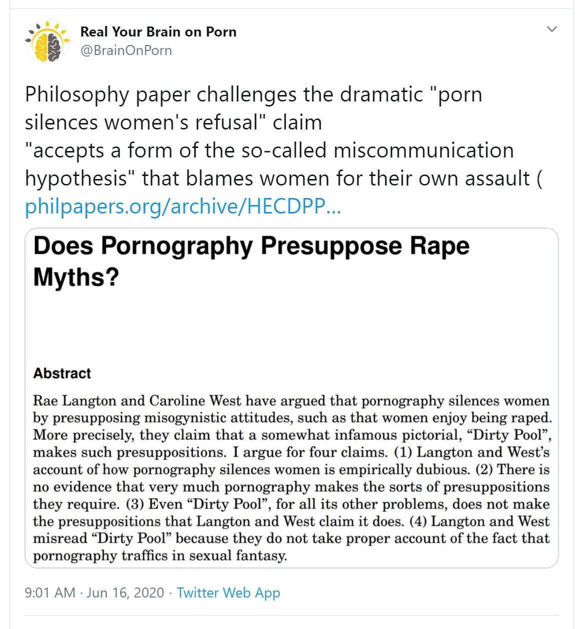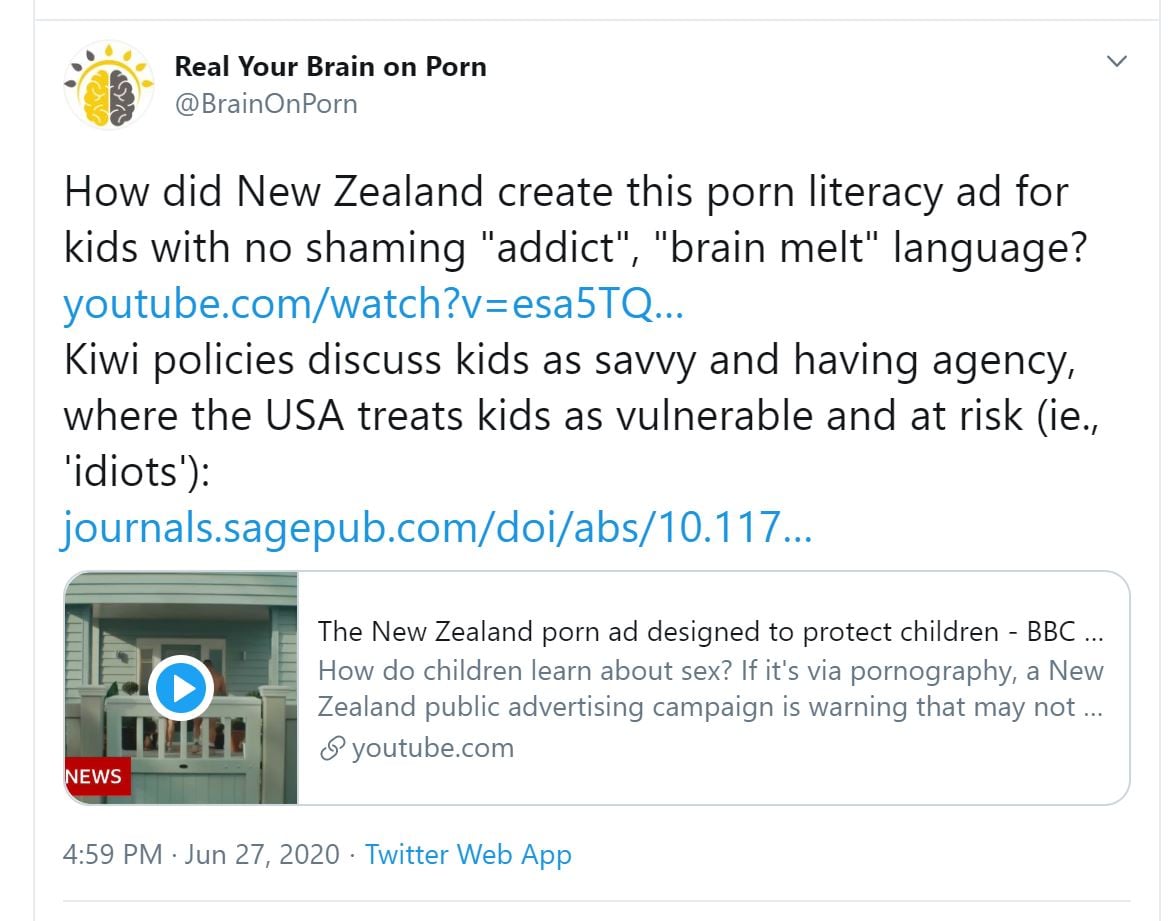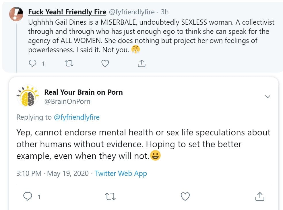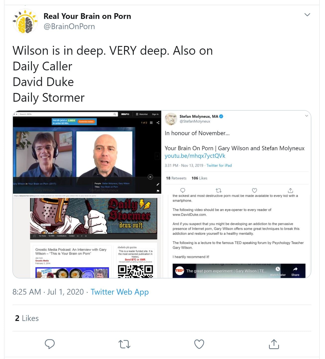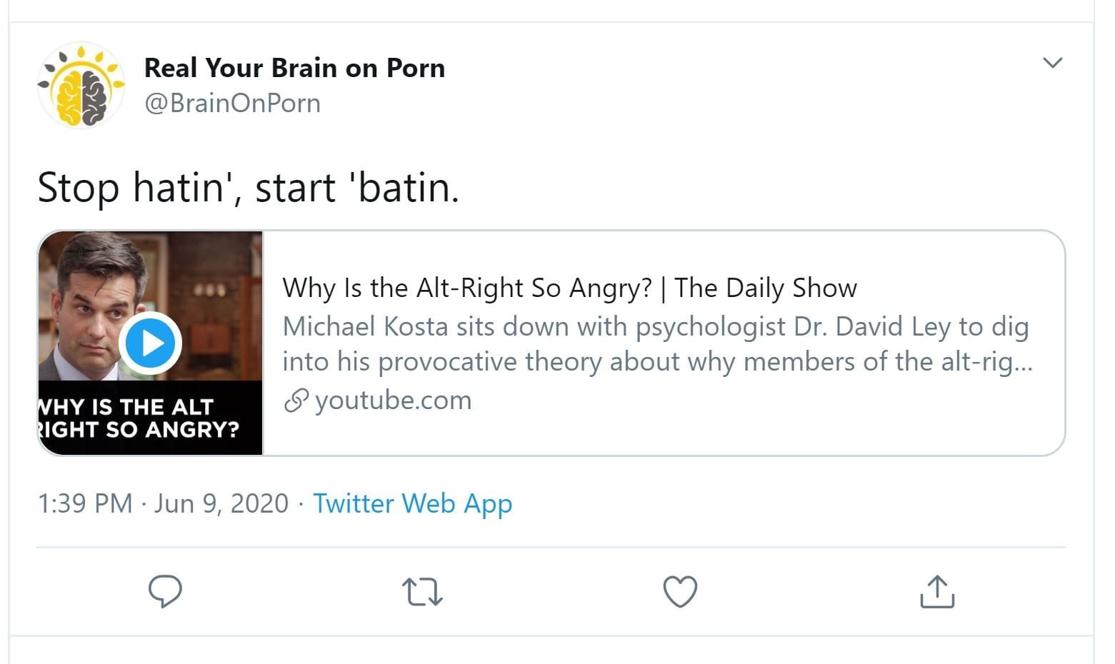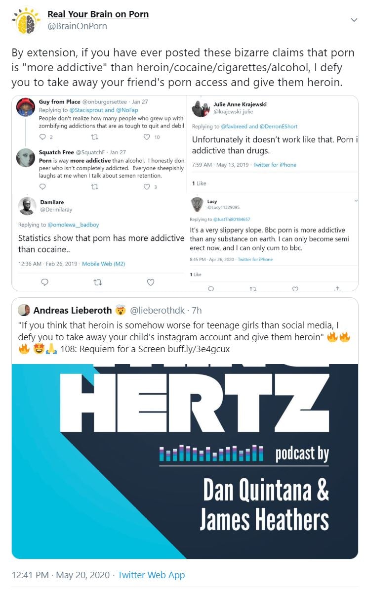 NOTE: In September, 2020 @BrainOnPorn attempted to rebrand itself as a commentary-on-YBOP account, but without commenting on the content of YBOP! Instead, Prause used Anti-Your Brain On Porn (@BrainOnPorn) solely to defame and lie about various individuals and organizations (approximately 1000 such tweets in the first 16 months of its existence). It cyberstalked my son and his mother, tweeting where they worked and lived, while defaming both in the most vile manner. @BrainOnPorn supplied no actual commentary or analysis. Many RealYBOP tweets have been omitted because they are too vile and defamatory.
