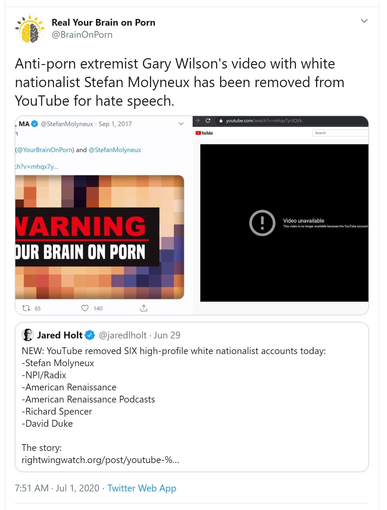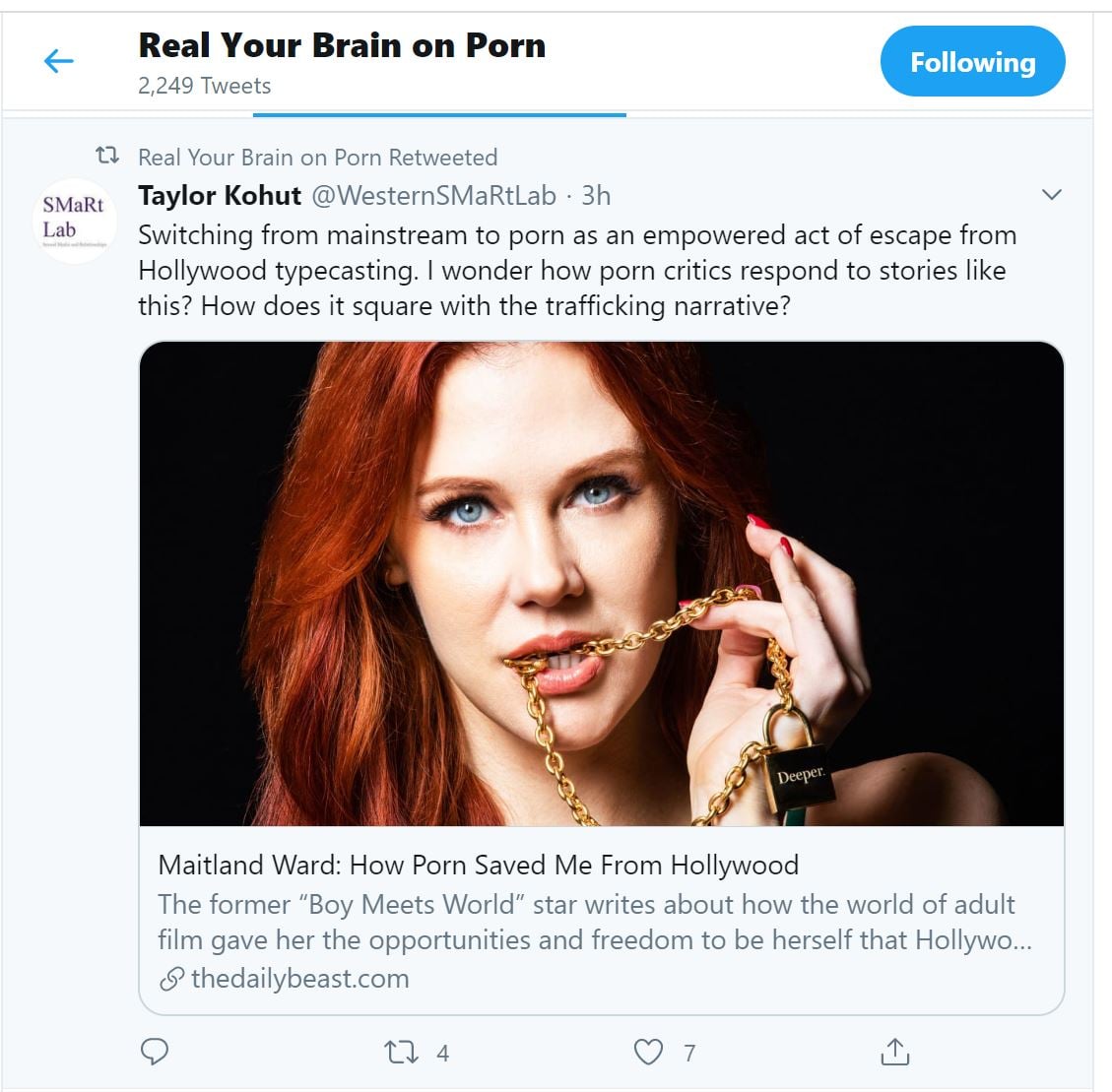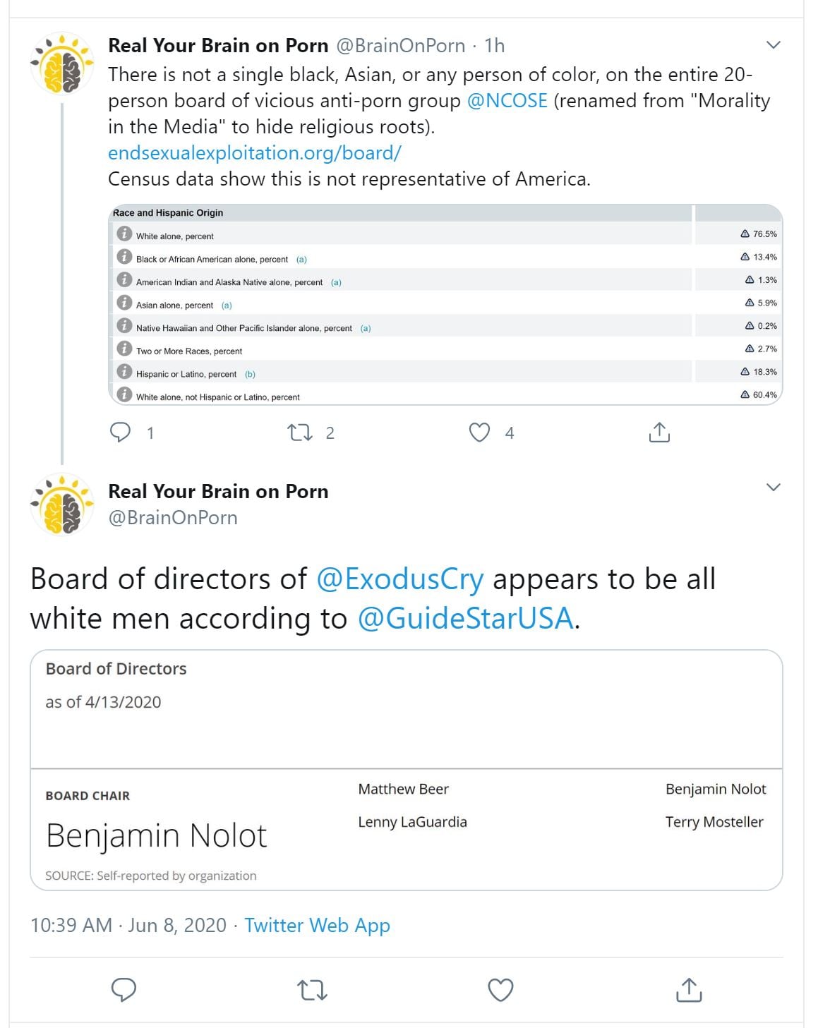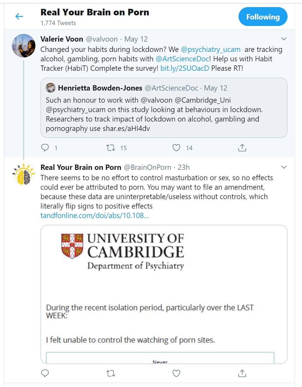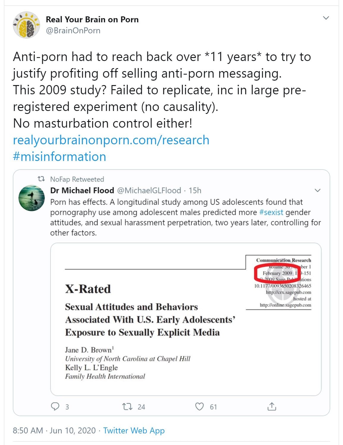 NOTE: In September, 2020 @BrainOnPorn attempted to rebrand itself as a commentary-on-YBOP account, but without commenting on the content of YBOP! Instead, Prause used Anti-Your Brain On Porn (@BrainOnPorn) solely to defame and lie about various individuals and organizations (approximately 1000 such tweets in the first 16 months of its existence). It cyberstalked my son and his mother, tweeting where they worked and lived, while defaming both in the most vile manner. @BrainOnPorn supplied no actual commentary or analysis. Many RealYBOP tweets have been omitted because they are too vile and defamatory.