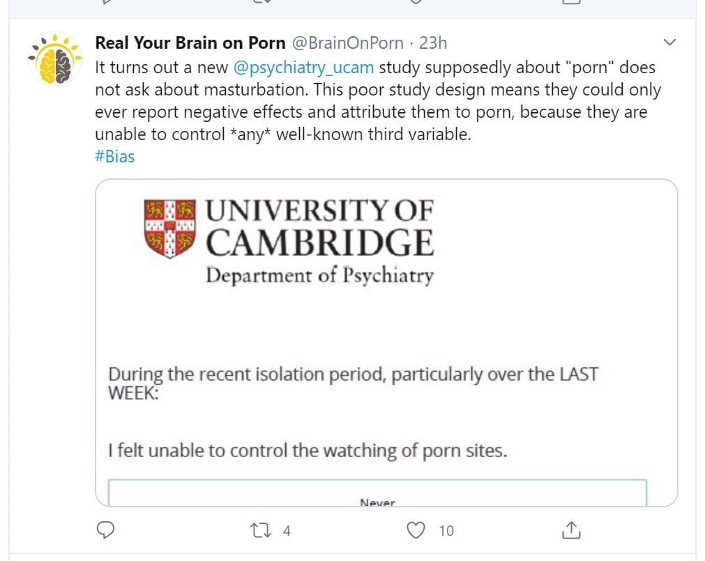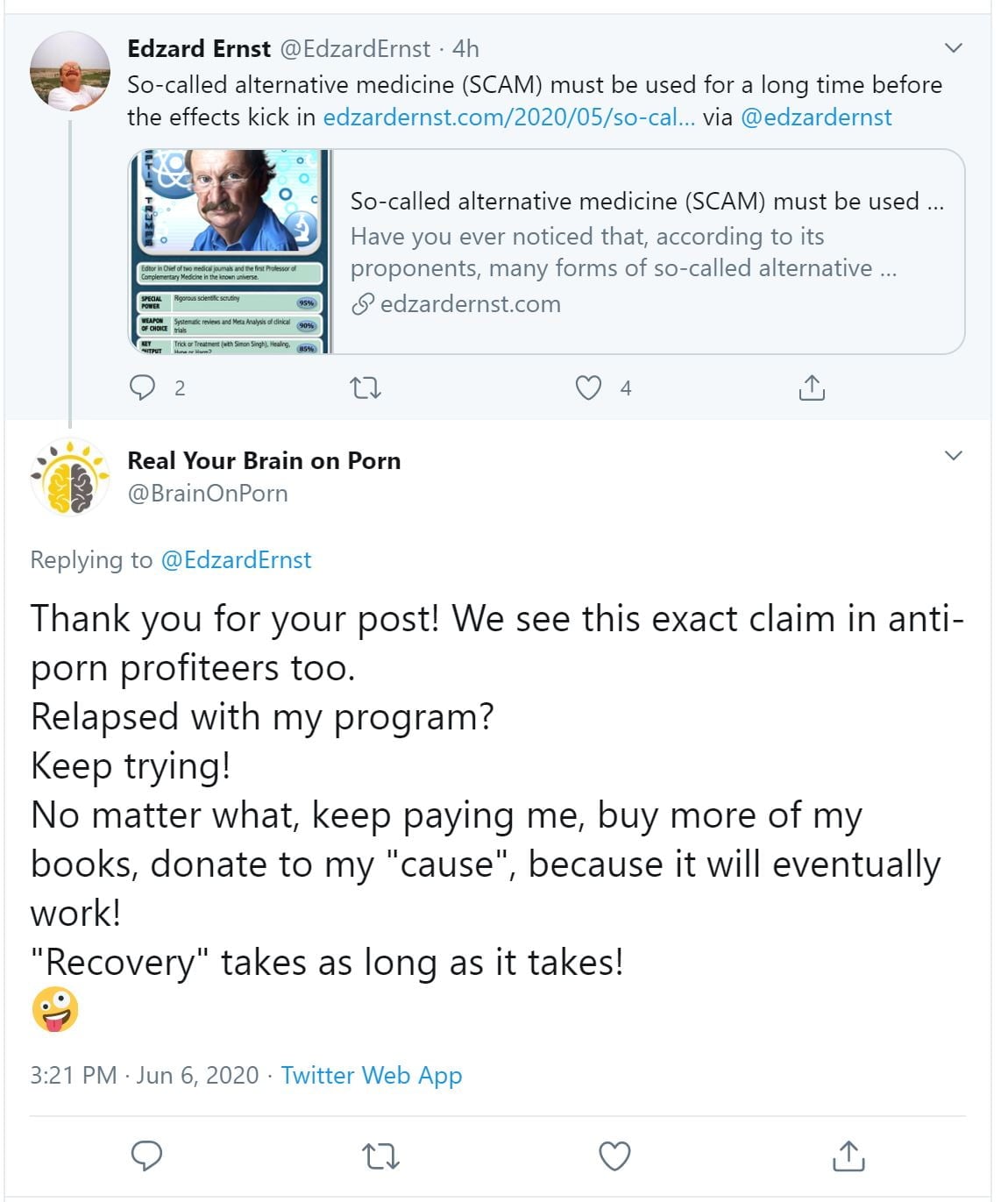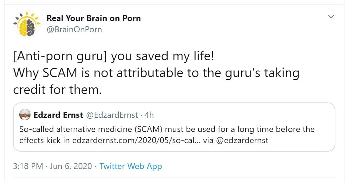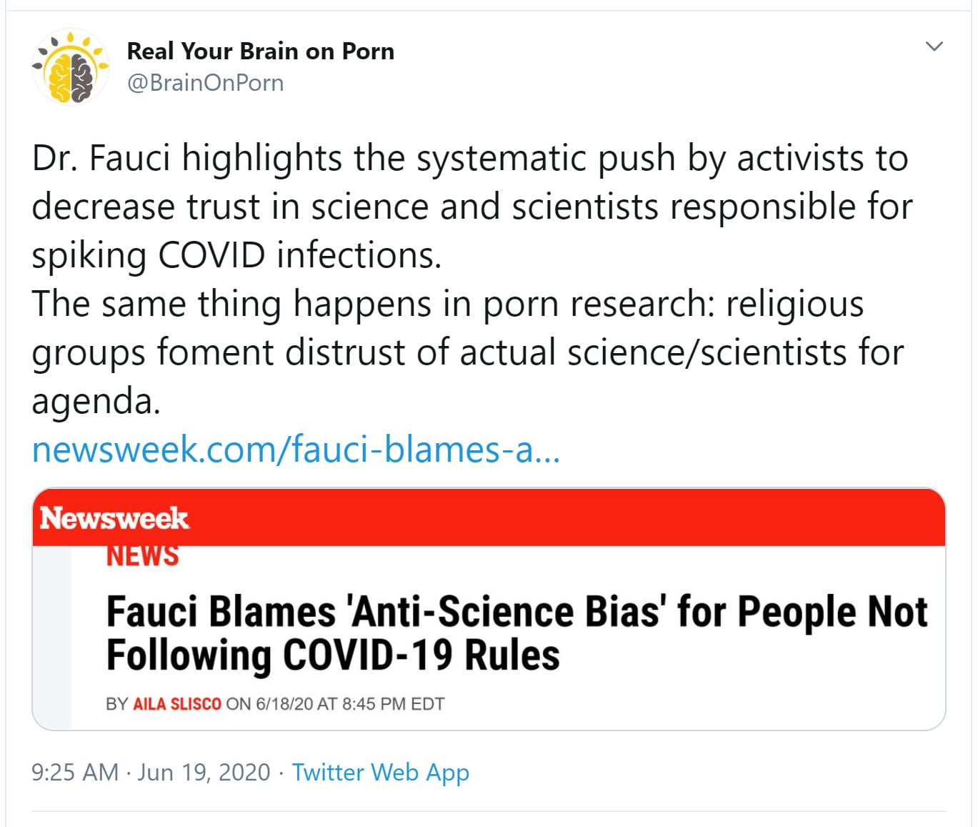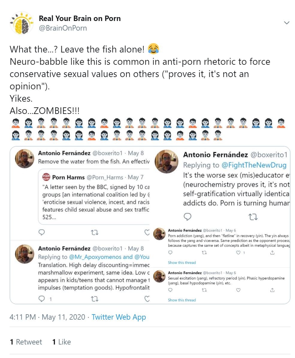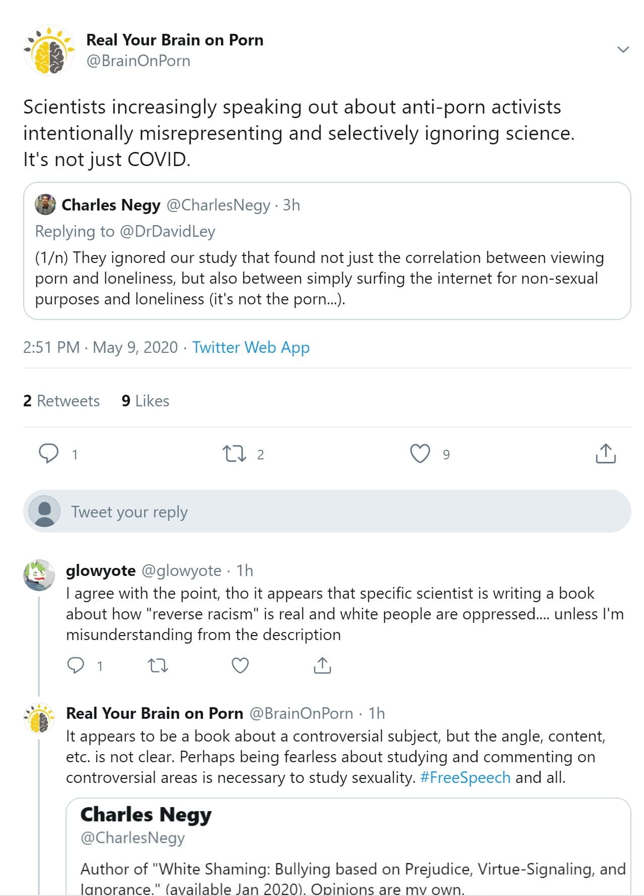 NOTE: In September, 2020 @BrainOnPorn attempted to rebrand itself as a commentary-on-YBOP account, but without commenting on the content of YBOP! Instead, Prause used Anti-Your Brain On Porn (@BrainOnPorn) solely to defame and lie about various individuals and organizations (approximately 1000 such tweets in the first 16 months of its existence). It cyberstalked my son and his mother, tweeting where they worked and lived, while defaming both in the most vile manner. @BrainOnPorn supplied no actual commentary or analysis. Many RealYBOP tweets have been omitted because they are too vile and defamatory.