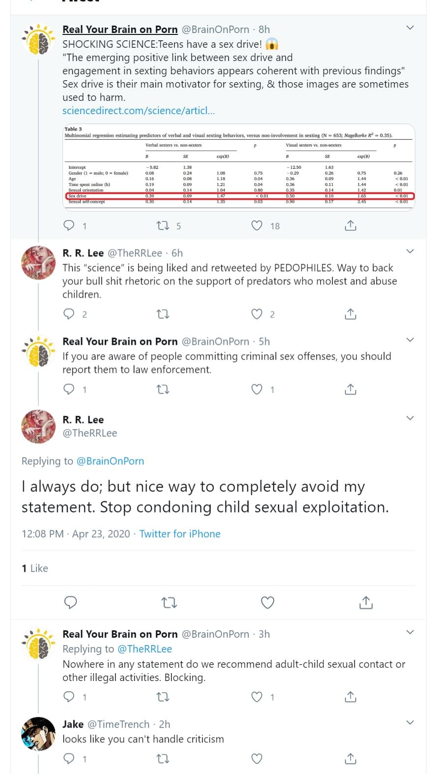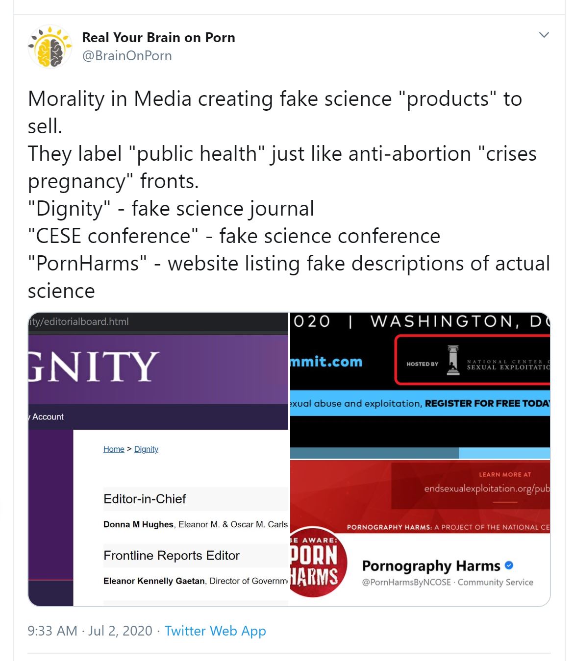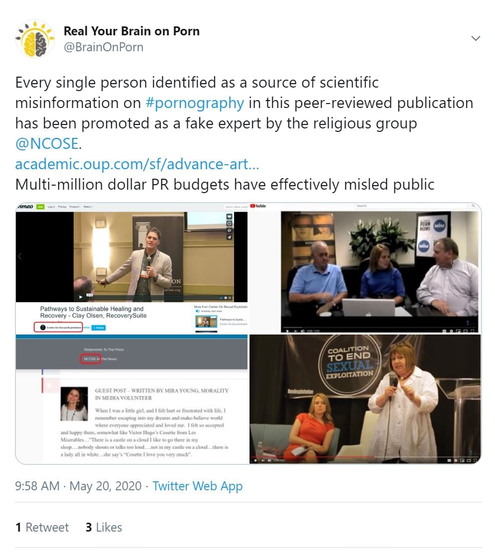 - July, 2020: RealYBOP (Prause) falsely accuses Staci Sprout of stating that RealYourBrainOnPorn researchers molest children.