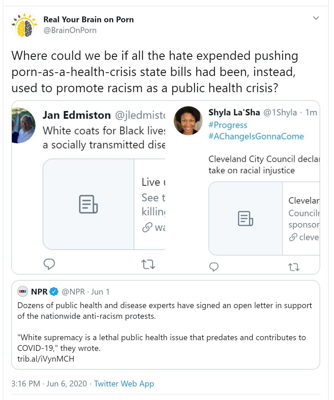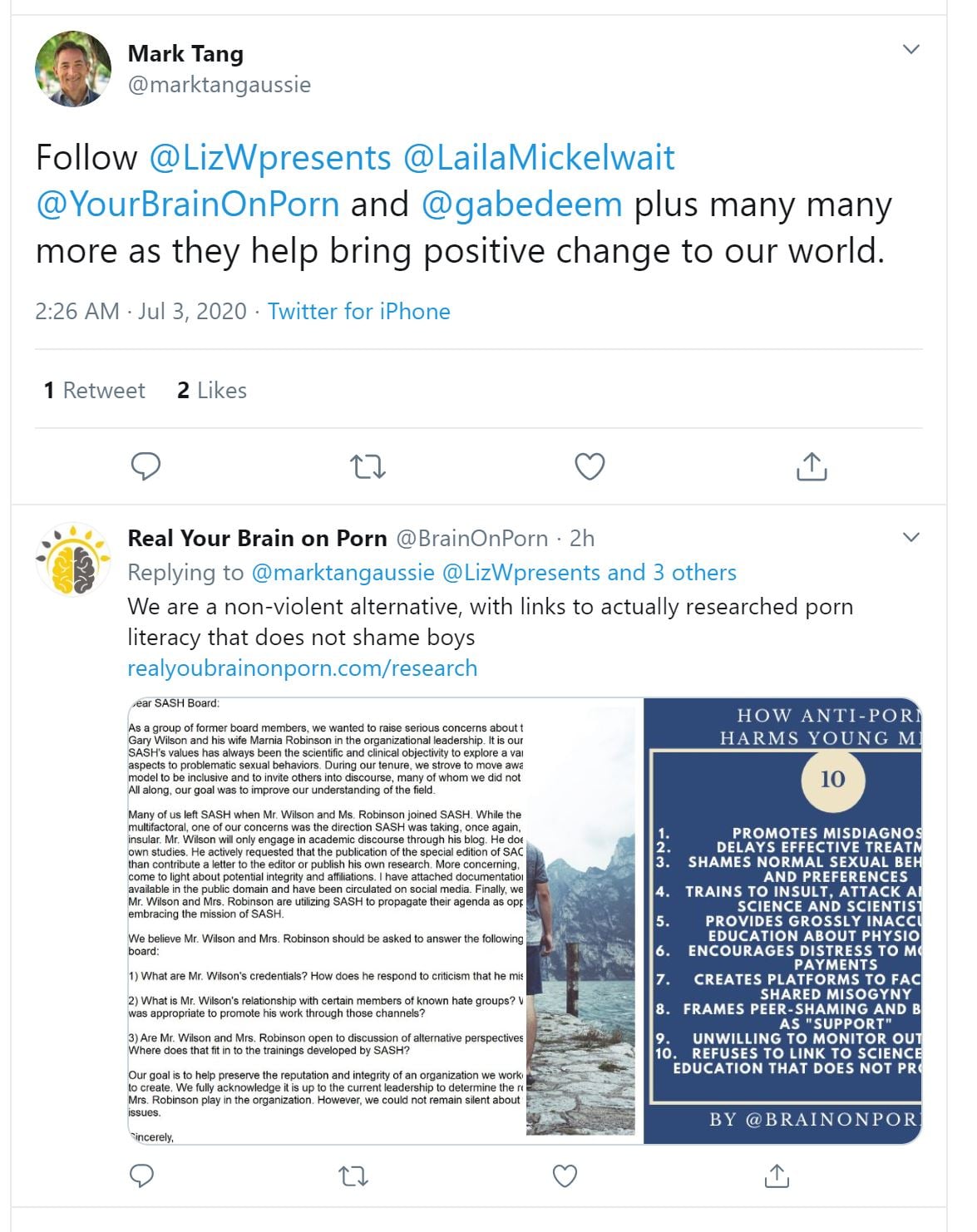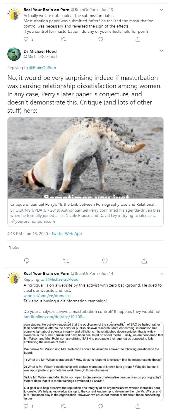 - July, 2020: RealYBOP (Prause) falsely accuses Staci Sprout of stating that RealYourBrainOnPorn researchers molest children.