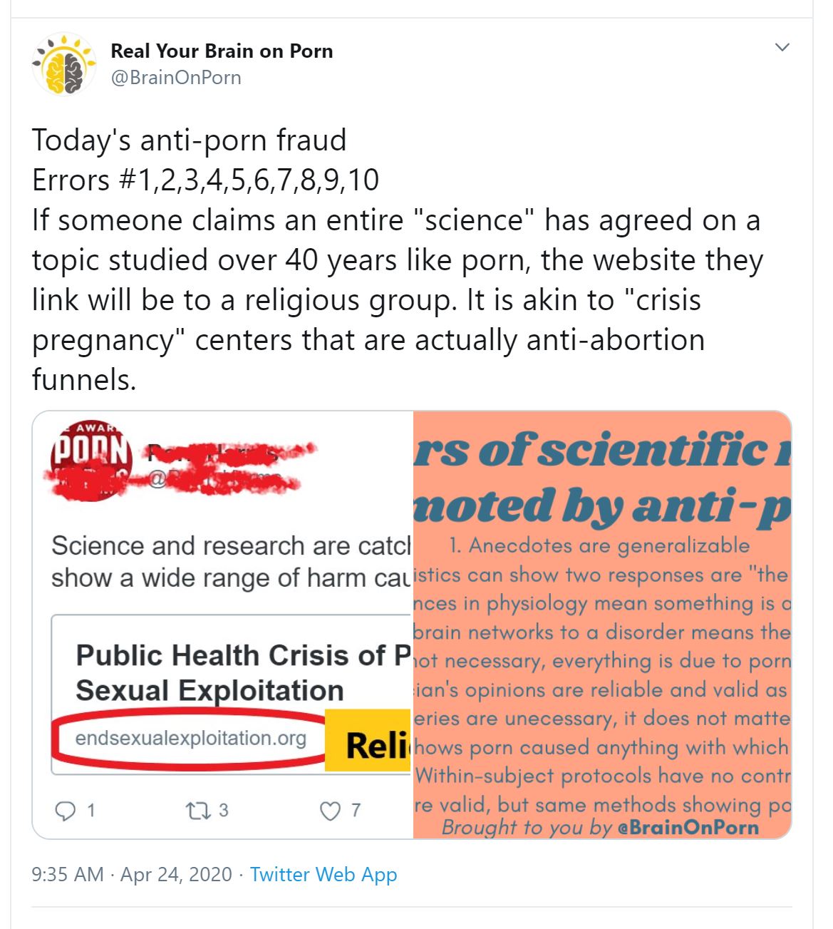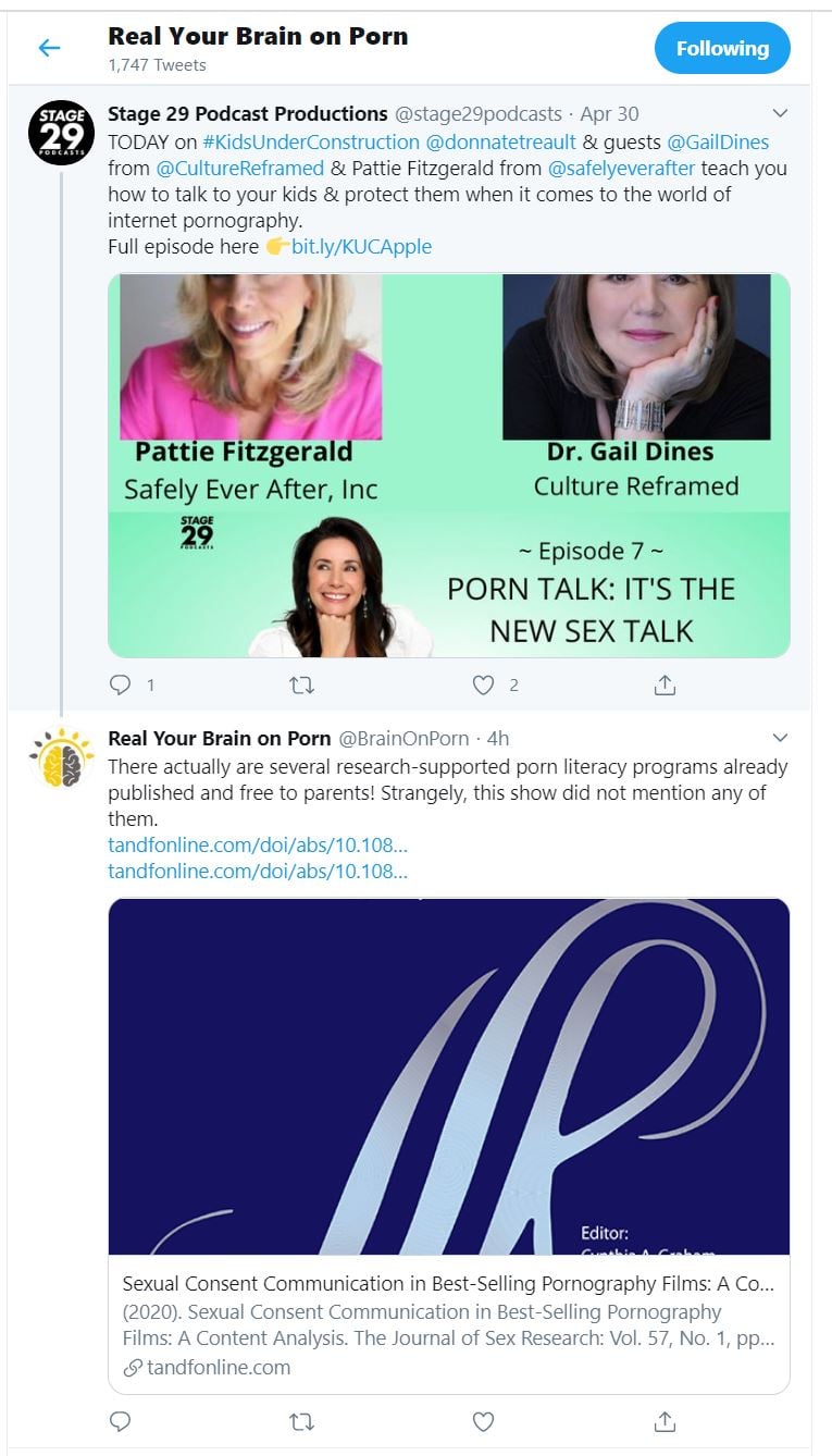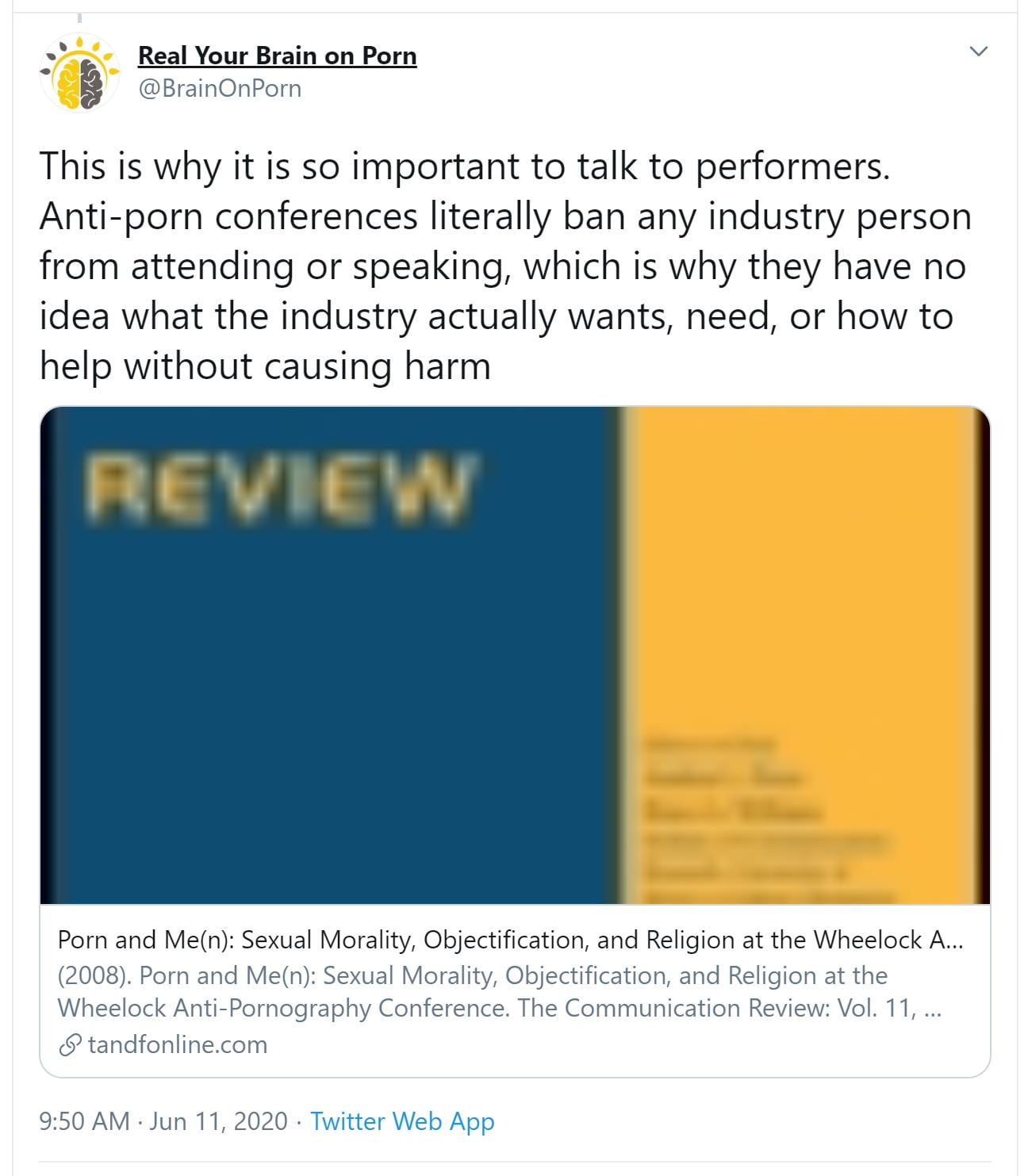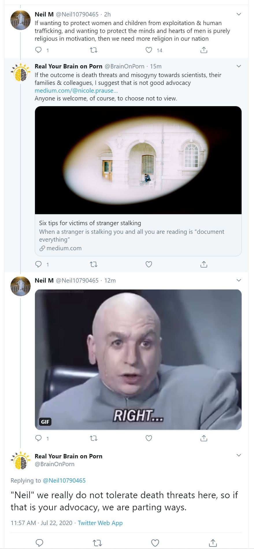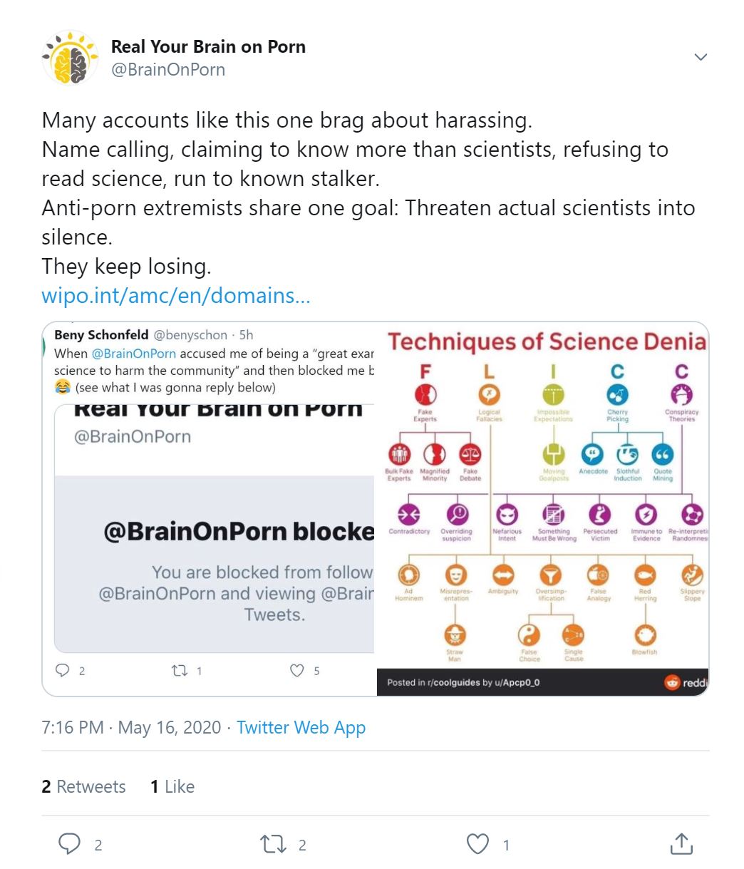 Bottom line – Prause no longer hides behind the illusion that @BrainOnPorn Twitter was anything other than a porn-industry shill account, created to fool the public, and to cyberstalk me and anyone else who speaks about the harms of porn or issues in the porn industry