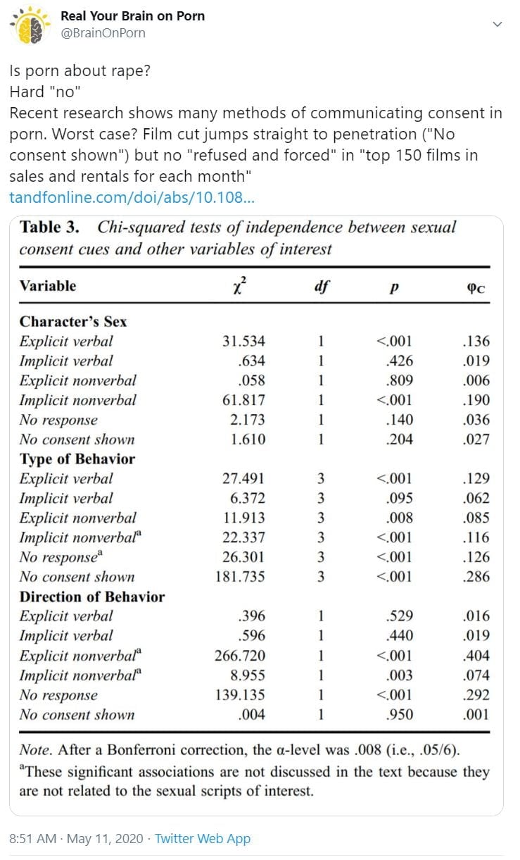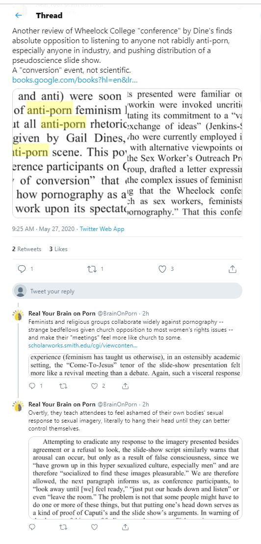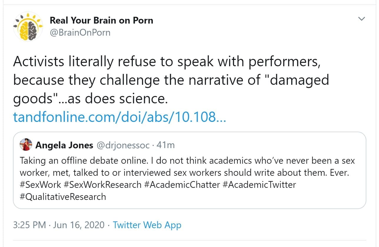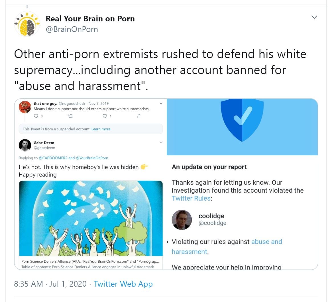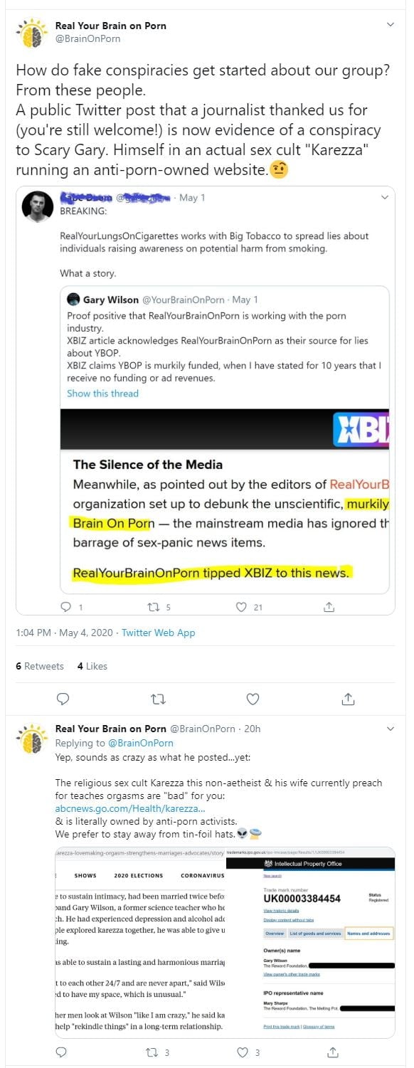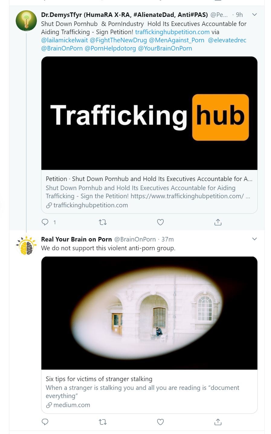 Bottom line – Prause no longer hides behind the illusion that @BrainOnPorn Twitter was anything other than a porn-industry shill account, created to fool the public, and to cyberstalk me and anyone else who speaks about the harms of porn or issues in the porn industry