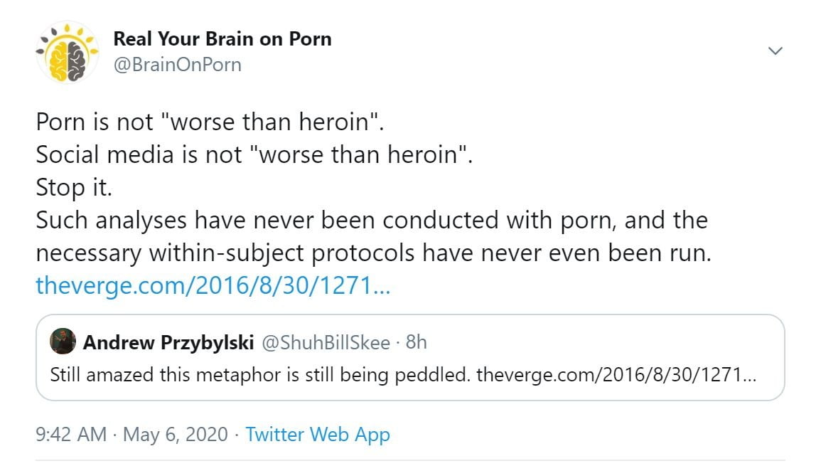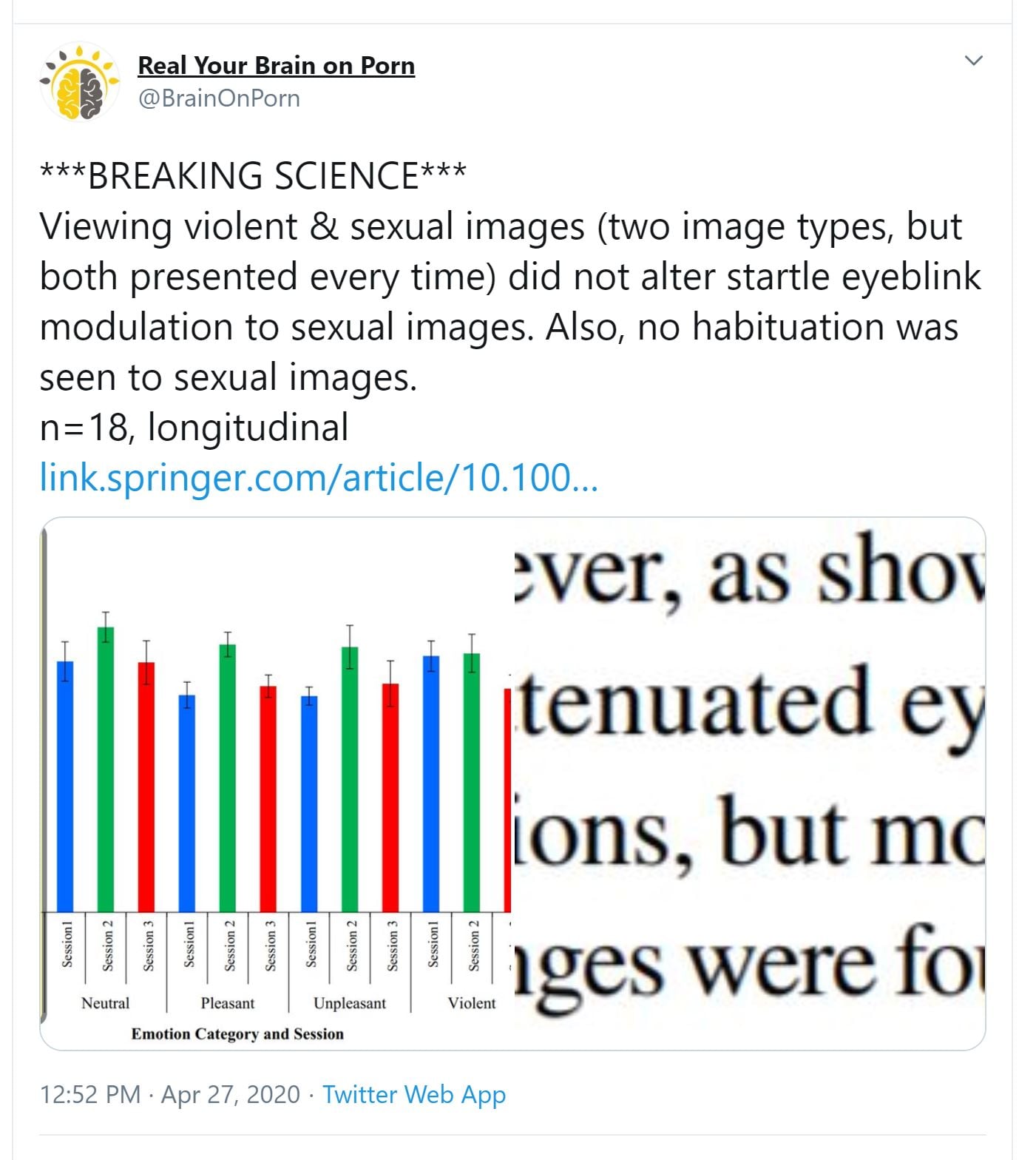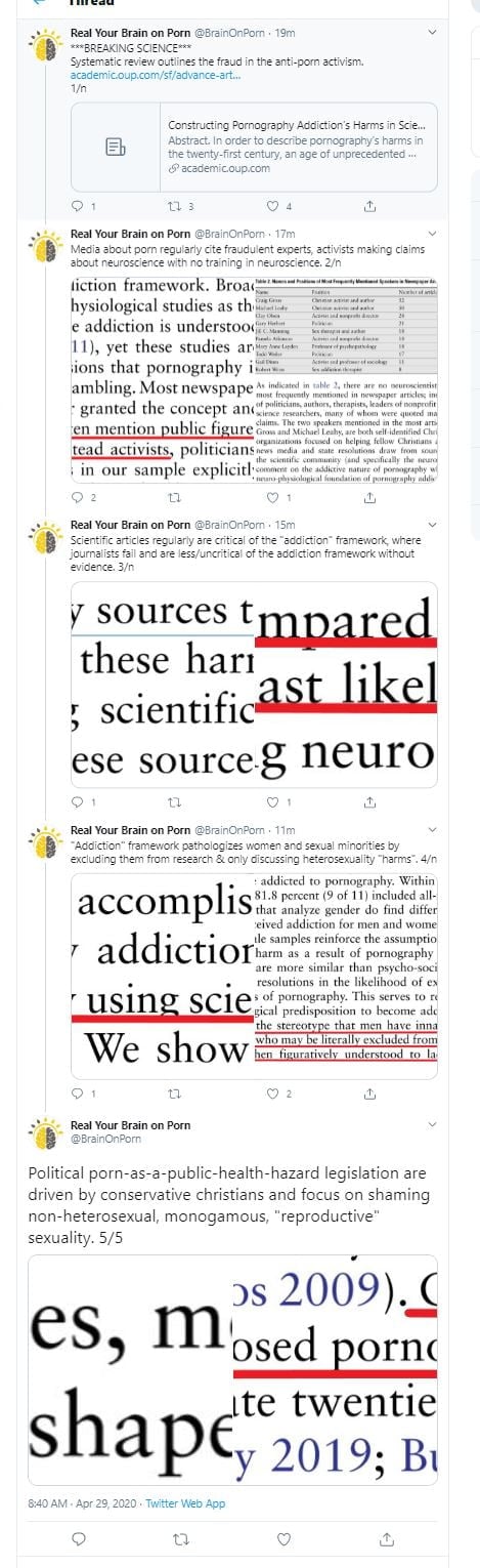 Little in RealYBOP’s tweets about this work is supported. The authors just published their opinions, using cherry-picked articles (not studies) to “support” their text. The paper did NOT review the studies related to porn addiction, so it can tell us nothing about porn addiction. The real experts’ opinions on porn/sex addiction? This list contains 25 recent neuroscience-based literature reviews & commentaries by some of the top neuroscientists in the world. All support the addiction model.