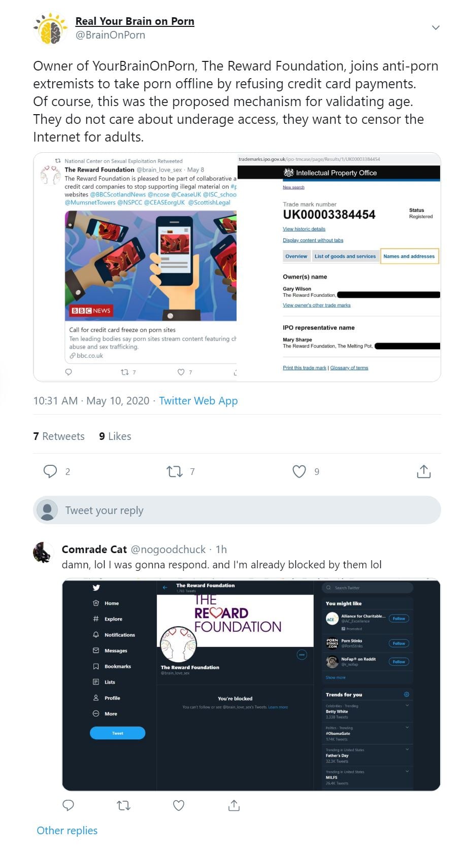These two stalkers (@BrainOnPorn & @NicoleRPrause, @nogoodchuck) often work together to defame and harass me, Nofap, and others. @nogoodchuck used to be @SexualSocialist (nerdykinkycommie) – and has other active accounts (@CommieKink). Prause and he are really tight, and cyberstalk as a tandem, as documented here: July, 2019: Prause supplies troll NerdyKinkyCommie with a YBOP trademark lawsuit document; NerdyKinkyCommie lies about a document; RealYBOP experts spread his libelous tweets, adding their own lies).