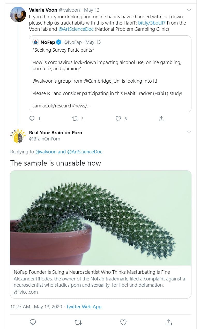 April 23, 2020: WOW. Direct support for Pornhub, while also attempting to disparage NoFap (who is suing Prause, who manages RealYBOP, for defamation):