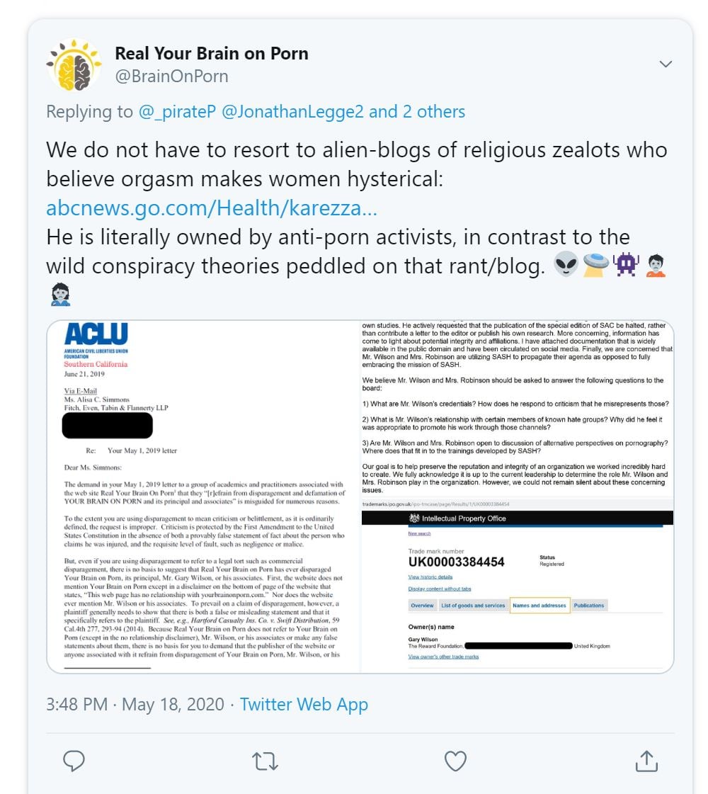 RealYBOP constantly engages in harassment and defamation of those who speak about porn’s negative effects (over 800 such tweets in its first year). We wonder who’s legally responsible for @BrainOnPorn‘s defamation and harassment? Is it only Nicole Prause, or the underlying website’s past owner(s), or maybe both? Or could all of the RealYBOP “experts” be held legally and financially responsible?