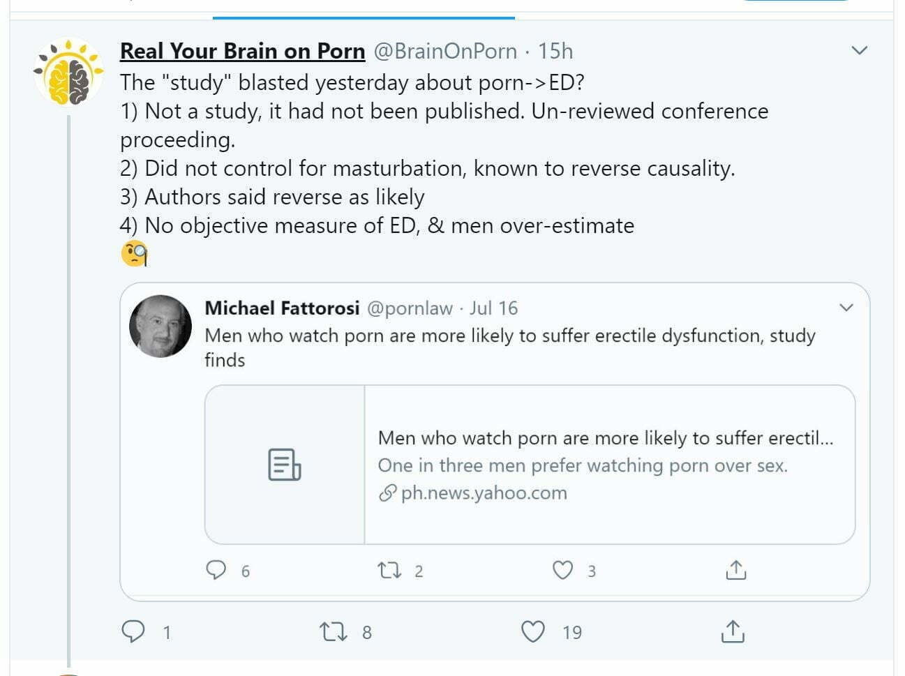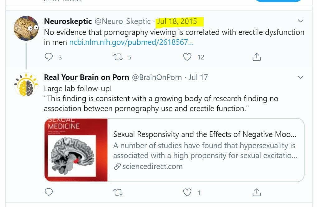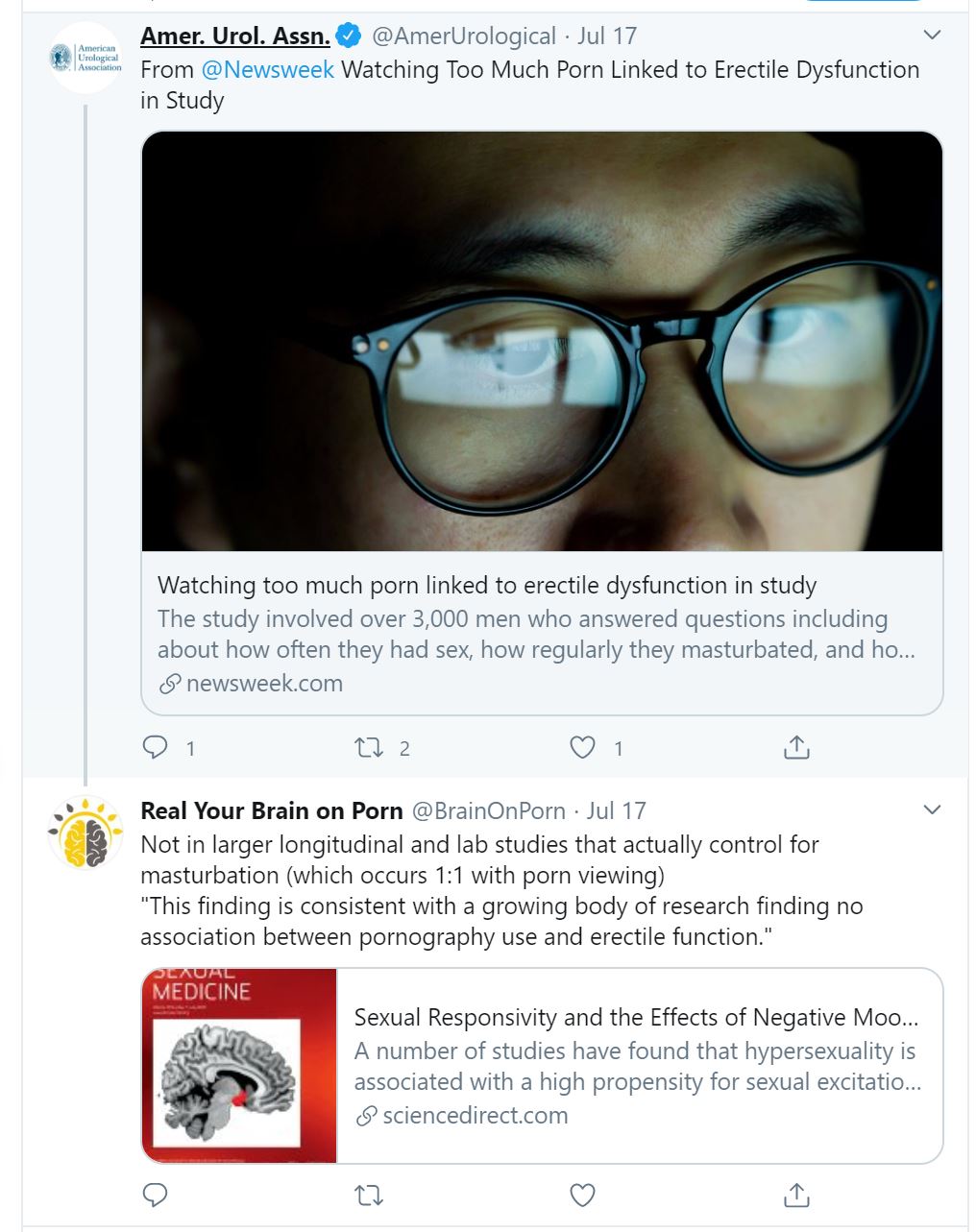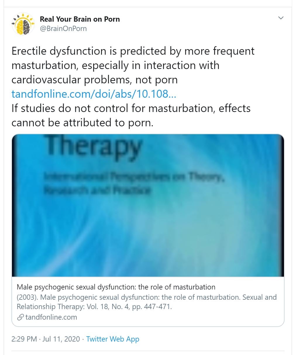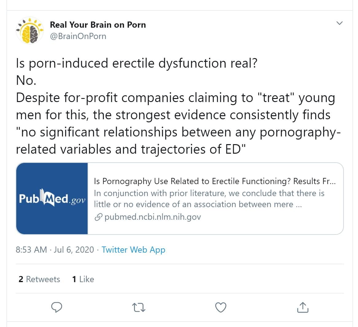 Tweets a paper from 2008, saying “still no porn causing ED.” The paper did not ask about porn use as a possible cause.