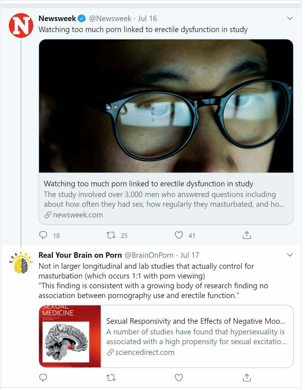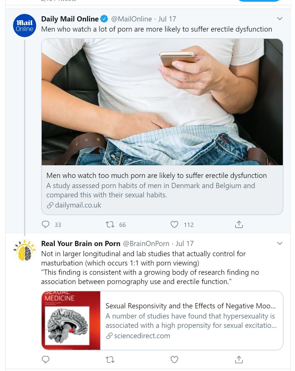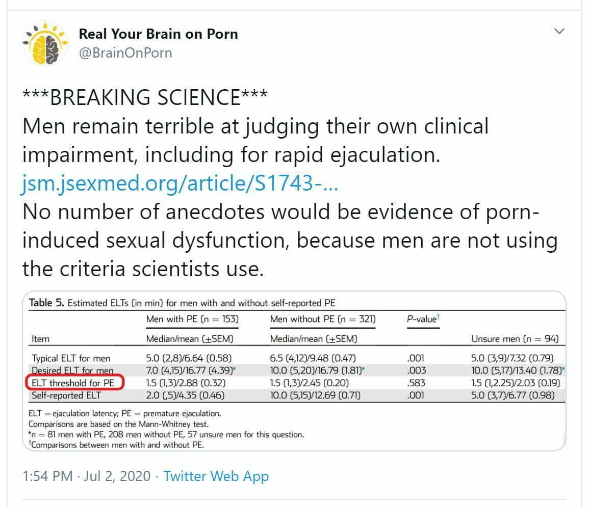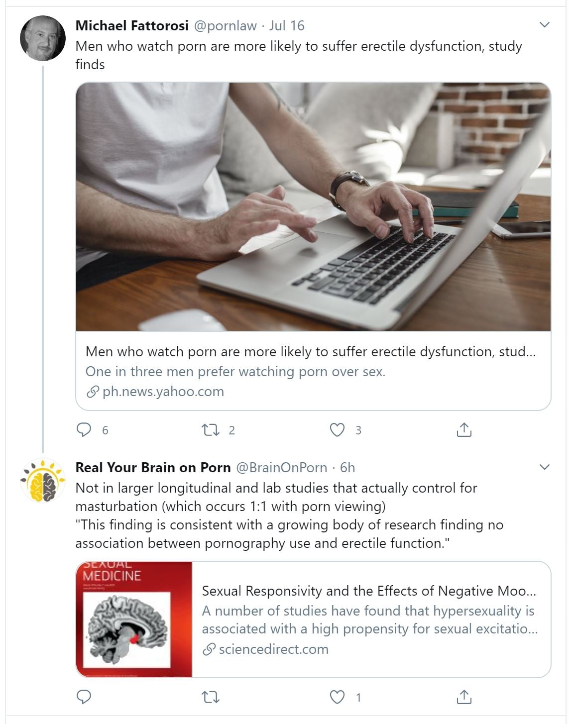 Tweets a paper from 2008, saying “still no porn causing ED.” The paper did not ask about porn use as a possible cause.