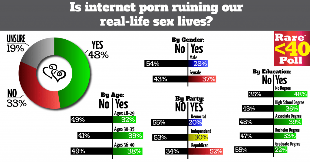 Under-40 Poll: Porn is ruining our sex lives? More young people than not say Internet porn has no effect on their real-life sex lives, according to a new Rare poll. Forty-eight percent said they weren’t bothered by it, while 33 percent of young voters said porn was having a negative effect. Nineteen percent were unsure.