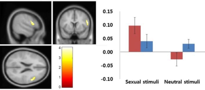 In order to investigate the behavioral and neural responses that were based solely on sexual desire, the imaging and psychological data for the three pictures that induced other emotions, such as disgust, anger, or surprise, other than sexual arousal were excluded from the data analysis. Independent t-tests of the frequencies and intensities of sexual desire between the two groups were performed using SPSS 22 (IBM Corporation, Armonk, NY, USA). The frequency of sexual desire was considered the number of stimuli for which each participant experienced sexual desire from among the total 20 sexual stimuli, and the intensity of sexual arousal was the average level of subjective sexual desire for the 20 erotic pictures.