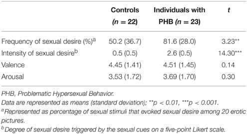 As hypothesized, the analyses of the results of the psychological assessments showed that the PHB group exhibited more frequent sexual desire than the control group during exposure to sexual stimuli, which suggested that this group had a lower threshold for sexual desire. When sexual desire was induced, the PHB group showed a higher intensity of sexual desire than the control group did. This result was consistent with previous findings on individuals with PHB group (Laier et al., 2013; Laier and Brand, 2014; Voon et al., 2014), especially demonstrate that the desire for pornography might play a key role in cybersex addiction.