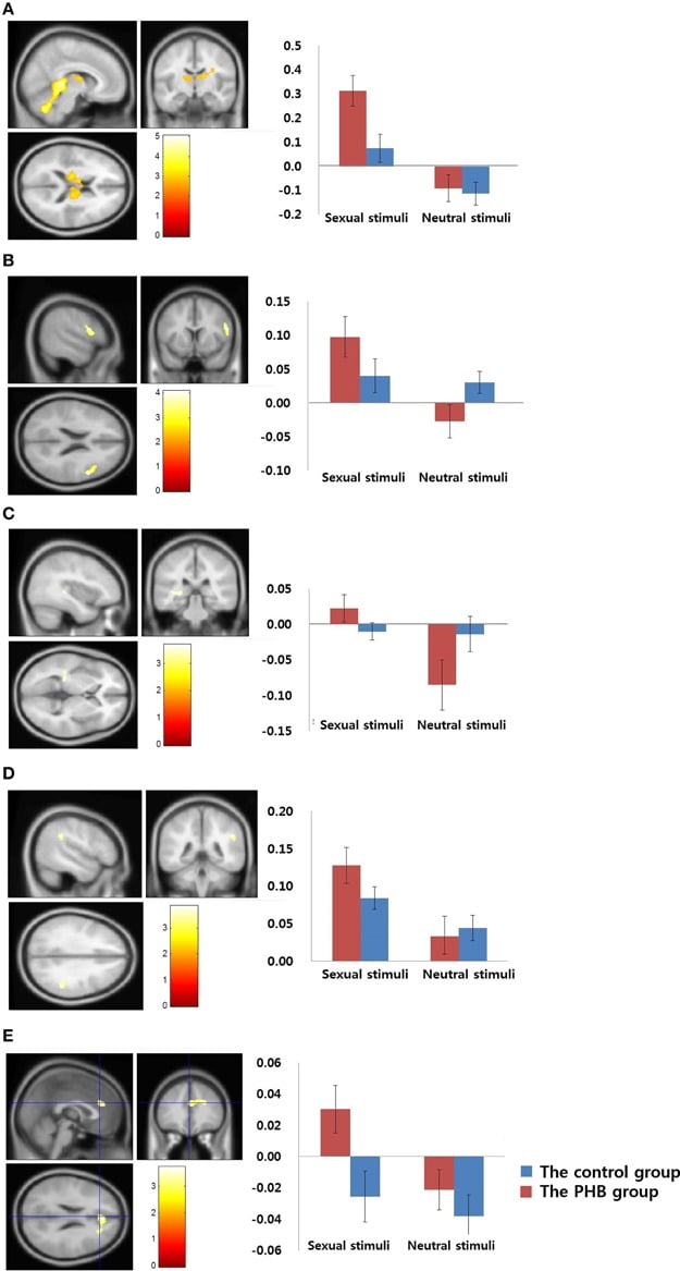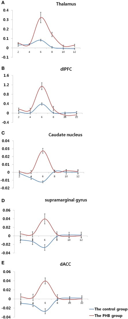 Figure 2. Results of the between-group analysis. (A) Bilateral thalamus (MNI coordinate; x = 6, y = −36, z = 4) (B) Right dorsolateral prefrontal cortex (MNI coordinate;x = 56, y = 10, z = 22) (C) Left caudate nucleus (MNI coordinate; x = −38, y = −32, z = 2)(D) Right supramarginal gyrus (MNI coordinate; x = 50, y = −42, z = 32) (E) Right dorsal anterior cingulate gyrus (MNI coordinate; x = 24, y = −16, z = 34). Results of the comparisons of activation in sexual stimuli minus nonsexual stimuli between the PHB and control groups (p < 0.05, False Discovery Rate, corrected). The control group and the PHB group are represented as blue and red, respectively. The y-axis shows the percent signal change and the error bars represents Standard Error of the Mean.