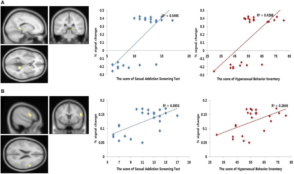 Figure 4. Results of the correlation analysis. Left, functional magnetic resonance imaging (fMRI) correlational analysis. The regions showing significant correlation between the brain activity during sexual desire and the Sexual Addiction Screening Test-R (SAST-R) scores (p < 0.001, uncorrected). Right, linear relationship between the percent signal changes extracted from each area and sexual severity scores [i.e., SAST-R and Hypersexual Behavior Inventory (HBI) scores]. The x-axis shows the sexual severity scores, and the y-axis represents the percent signal change. (A) Bilateral thalamus (MNI coordinate; x = 4, y = −32, z = 6) (B) Right dorsolateral prefrontal cortex (MNI coordinate; x = 56, y = 8, z = 22).