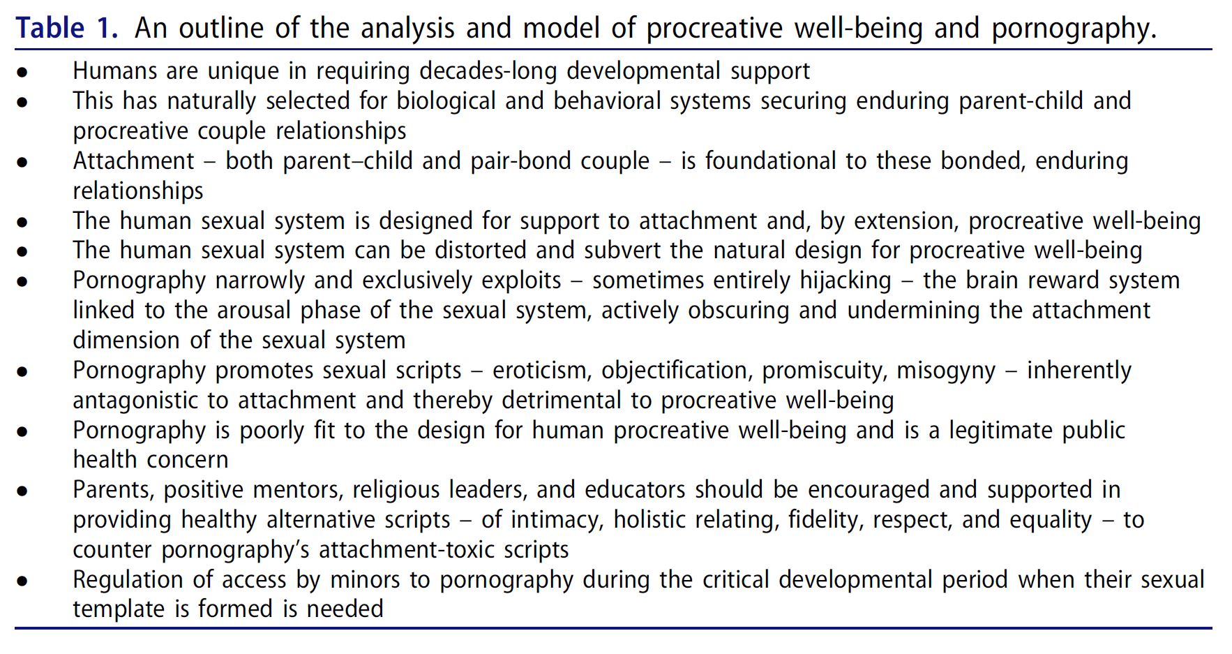 An ethological model of human procreative well-being is proposed and the goodness-of-fit of pornography’s script to that model is considered. Deducing an evolutionary template for procreative well-being from an ethological analysis links attachment dynamics to procreative success. Alongside parent–child attachment, pair-bond attachment in the procreative couple looms large as an element of optimal procreative relationship structure and quality. Key elements of pair-bond attachment are documented. Turning next to an empirical examination of the sexual behavioral system in humans, we see evidence of an evolutionary design supportive of attachment as well as reproductive exigencies of procreative well-being. Sexual system mechanisms promoting both reproduction and attachment are evident in the evolutionary design. We next employ script theory to identify key elements of the sexual script promulgated by pornography. Joining these two analyses, we compare the evolutionary, attachment-based template for procreative success in juxtaposition to pornography’s sexual script to evaluate the goodness-of-fit of pornography use to attachment success and, by extension, procreative well-being. We conclude that there is an ethological case to be made for considering pornography use as a public health risk. Implications of the model of procreative well-being for the practice of couple therapy are given mention.