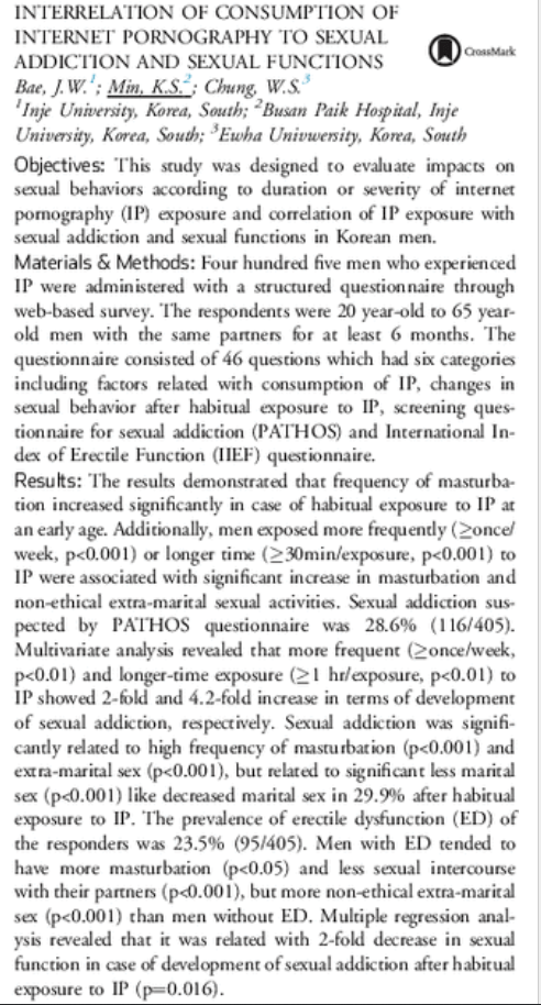 Once again, few regular porn users realize how porn has affected them until well after they cease using. Often ex-users need several months to fully recognize the negative effects. Thus, a study like this one has major limitations.