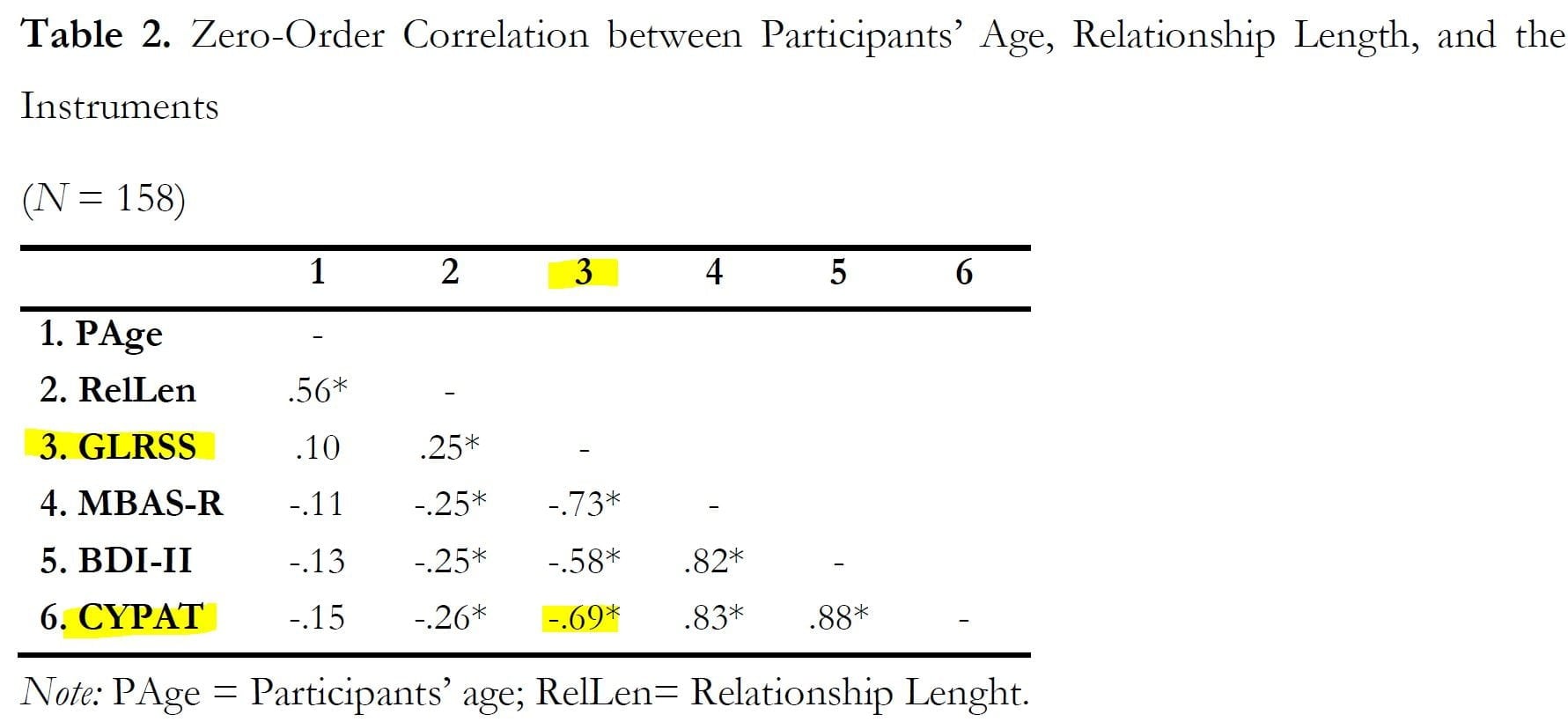 TABLE 2 – “Furthermore, the Gay and Lesbian Relationship Satisfaction Scale (GLRSS; Sommantico et al., 2019) was highly significantly negatively correlated with the MBAS-R, BDI-II, and CYPAT, with r values ranging from -.58 to -.73.”