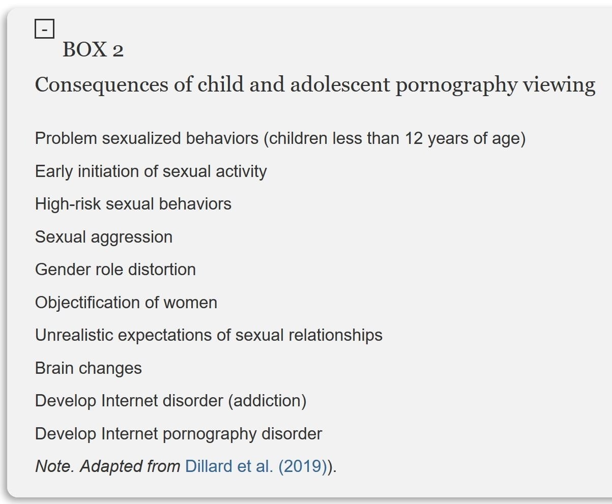 See Box 2 for possible consequences of child and adolescent pornography viewing. The primary concern related to pornography viewing in young children under the age of 12 years is the development of problem sexualized behaviors (PSB). PSB involves sexual knowledge beyond what would be expected for the child’s age and developmental levels, such as children engaging in sophisticated sexual acts such as intercourse or oral sex (Mesman, Harper, Edge, Brandt, & Pemberton, 2019). Chaffin et al. (2008)) states that these PSB in children less than 12 years of age are the result of several factors, including pornography viewing. PSB in young children has also been linked to trauma and violence, insufficient supervision, and impulse control problems (National Child Traumatic Stress Network, 2009). Dillard, Maguire-Jack, Showalter, Wolf, & Letson (2019)) found children less than 12 years of age who disclosed engaging in pornography viewing were at significantly higher odds of engaging in PSB when compared with their non–pornography exposed peers. Social learning theory provides a framework for understanding this phenomenon. Exposure to pornography at a young age not only introduces children to sexual behaviors but also reinforces the behaviors. Reinforcement occurs because of viewing depictions of rewards (pleasure) when engaging in sexual behaviors (Dillard et al., 2019). Any link between PSB and adolescent sexually abusive behaviors is unclear, and the risk is considered to be low if the child receives proper mental health treatment (Chaffin et al., 2008). However, children engaging in PSB and adolescents engaging in sexually abusive behaviors share common risk factors, including a history of child maltreatment (Yoder, Dilliard, & Leibowitz, 2018) and early exposure to pornography (Dillard et al., 2019).